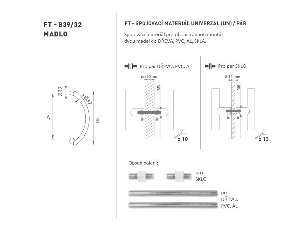 Madlo na dveře je vyrobeno z vysoce kvalitní nerezavějící oceli, známé jako nerez a je povrchově upraveno. Profil madla je Ø 32 mm. Sada UNIVERZÁL (UN) obsahuje spojovací materiál pro oboustrannou montáž dvou madel do dřeva, PVC, AL, skla.