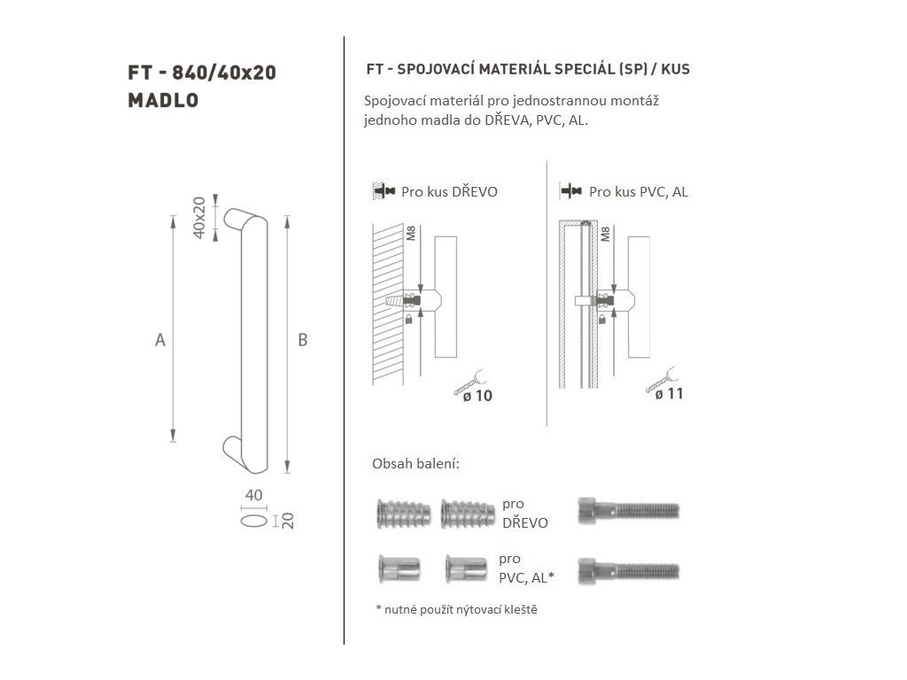 Madlo na dveře je vyrobeno z vysoce kvalitní nerezavějící oceli, známé jako nerez a je povrchově upraveno. Profil madla je 40x20 mm. Sada SPECIÁL (SP) obsahuje spojovací materiál pro jednostrannou montáž jednoho madla do dřeva, PVC, AL.