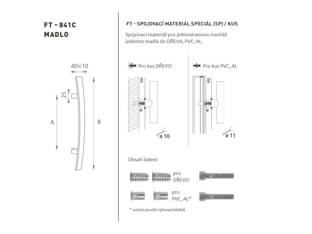Madlo na dveře je vyrobeno z vysoce kvalitní nerezavějící oceli, známé jako nerez a je povrchově upraveno. Profil madla je 40x10 mm. Sada SPECIÁL (SP) obsahuje spojovací materiál pro jednostrannou montáž jednoho madla do dřeva, PVC, AL.