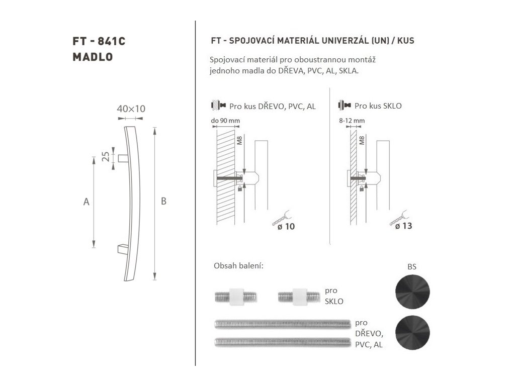 Madlo na dveře je vyrobeno z vysoce kvalitní nerezavějící oceli, známé jako nerez a je povrchově upraveno. Profil madla má rozměr 40 x 10 mm. Sada UNIVERZÁL (UN) obsahuje spojovací materiál pro oboustrannou montáž dvou madel do dřeva, PVC, AL, skla.