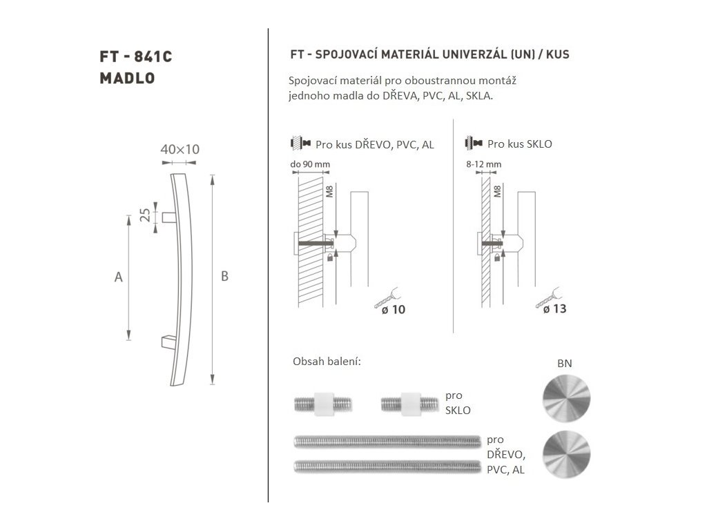 Madlo na dveře je vyrobeno z vysoce kvalitní nerezavějící oceli, známé jako nerez a je povrchově upraveno. Profil madla má rozměr 40 x 10 mm. Sada UNIVERZÁL (UN) obsahuje spojovací materiál pro oboustrannou montáž dvou madel do dřeva, PVC, AL, skla.