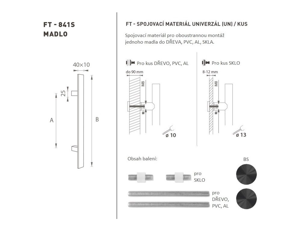 Madlo na dveře je vyrobeno z vysoce kvalitní nerezavějící oceli, známé jako nerez a je povrchově upraveno. Profil madla je 40 x 10 mm. Sada UNIVERZÁL (UN) obsahuje spojovací materiál pro oboustrannou montáž jednoho madla do dřeva, PVC, AL, skla.