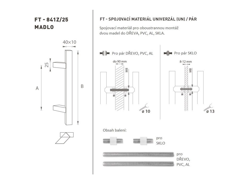 Madlo na dveře je vyrobeno z vysoce kvalitní nerezavějící oceli, známé jako nerez a je povrchově upraveno. Profil madla je 40 x 10 mm. Sada UNIVERZÁL (UN) obsahuje spojovací materiál pro oboustrannou montáž jednoho madla do dřeva, PVC, AL, skla. Madlo s délkou 1800 mm má 3 úchyty.