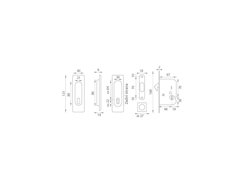 Hranatý set na posuvné dveře s otvorem pro interiérový klíč (BB).