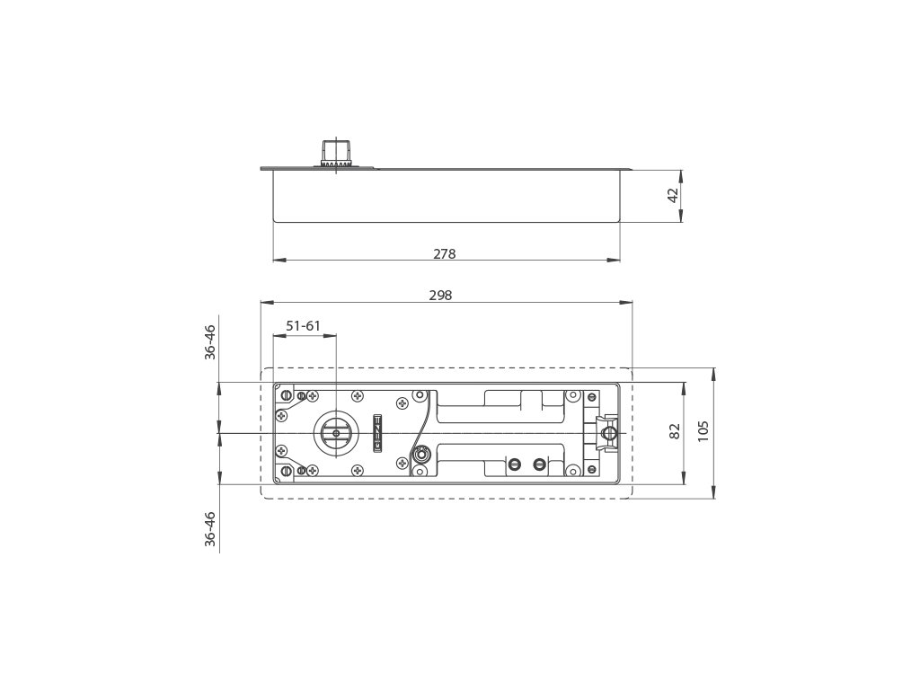 Podlahový samozavírač GEZE - TS 500 NV 1-4 má možnost nastavení rychlosti zavírání dveří a hydraulického koncového dorazu při zavírání. Také nastavení polohy trvalého otevření - 80 ° - 90 ° - 105 ° - 120 ° a fixní tlumení otevírání.