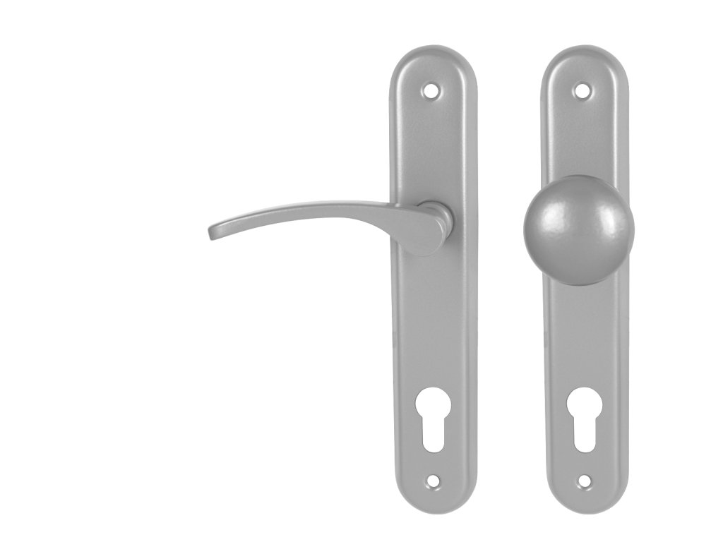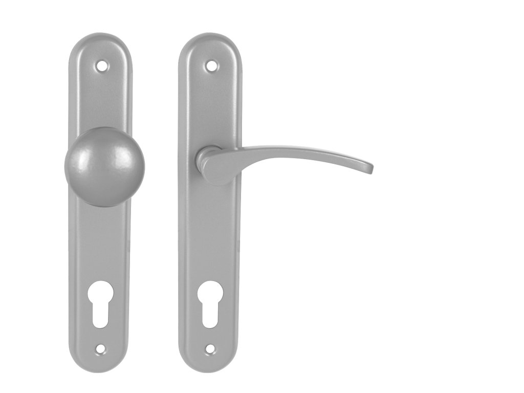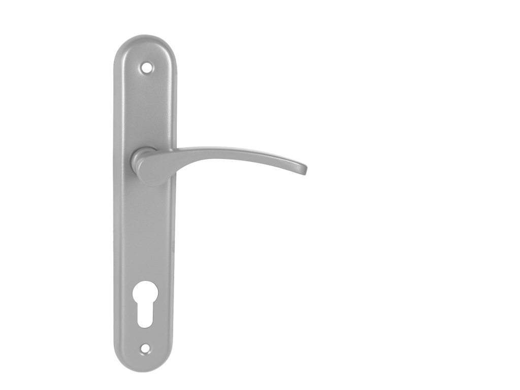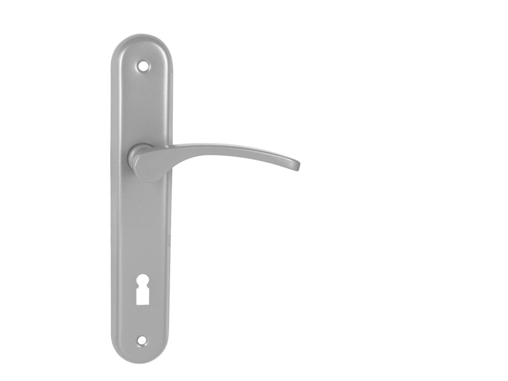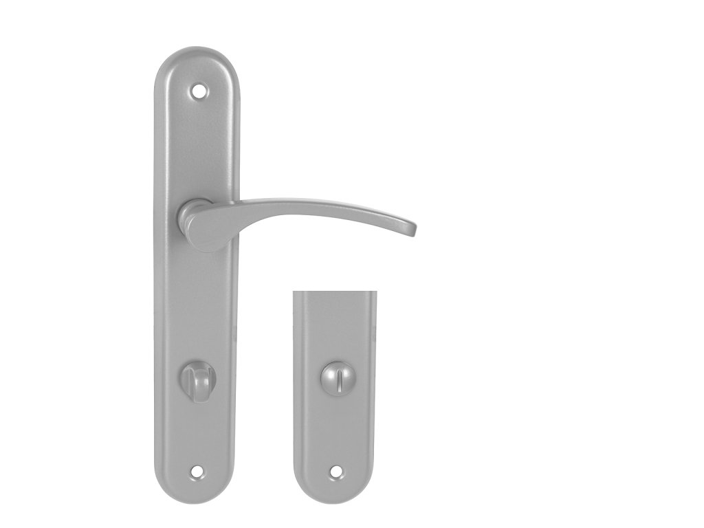 Štítová klika na interiérové dveře s oválným štítem je vyrobena z hliníku a je povrchově upravena. Oválný štít má rozměry 42 mm x 230 mm a klika neobsahuje vratný mechanismus.