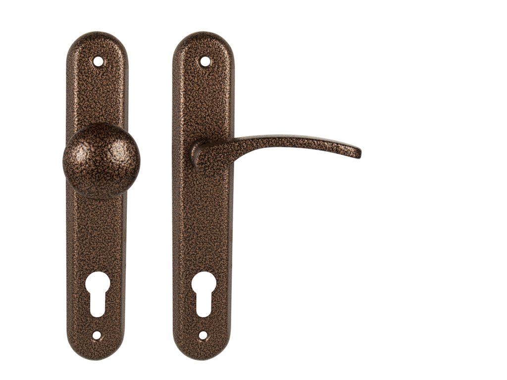 Štítová klika na interiérové dveře s oválným štítem je vyrobena z hliníku a je povrchově upravena. Oválný štít má rozměry 42 mm x 230 mm a klika neobsahuje vratný mechanismus.