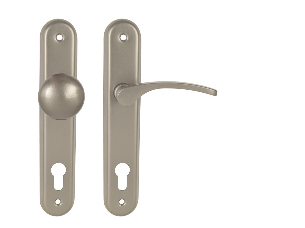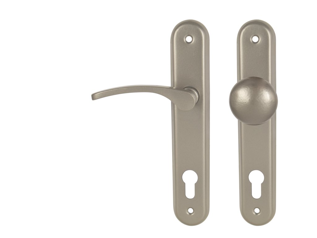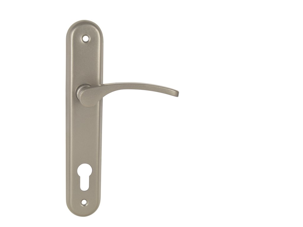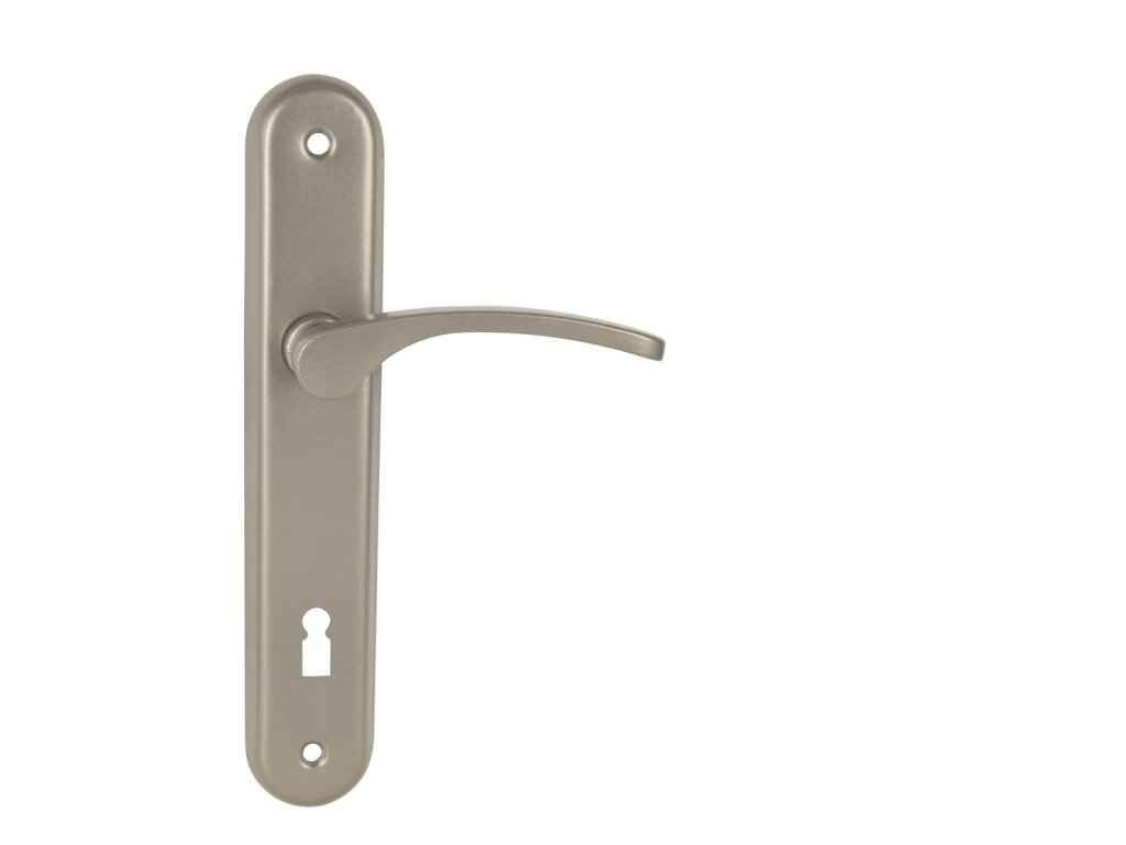 Štítová klika na interiérové dveře s oválným štítem je vyrobena z hliníku a je povrchově upravena. Oválný štít má rozměry 42 mm x 230 mm a klika neobsahuje vratný mechanismus.