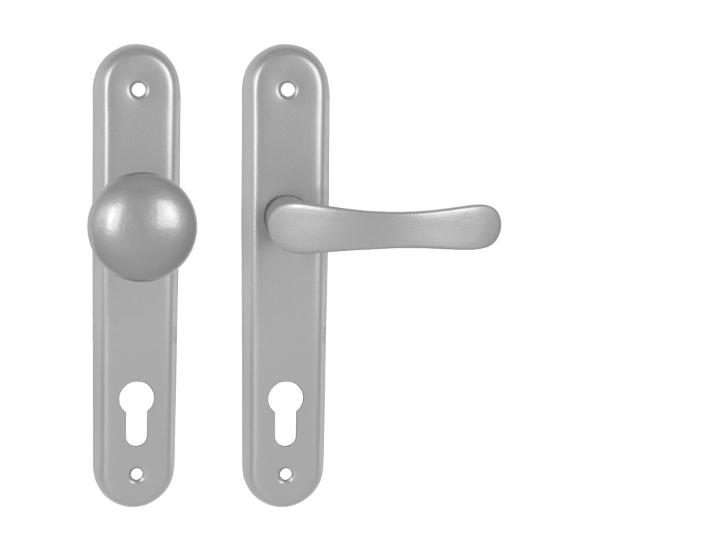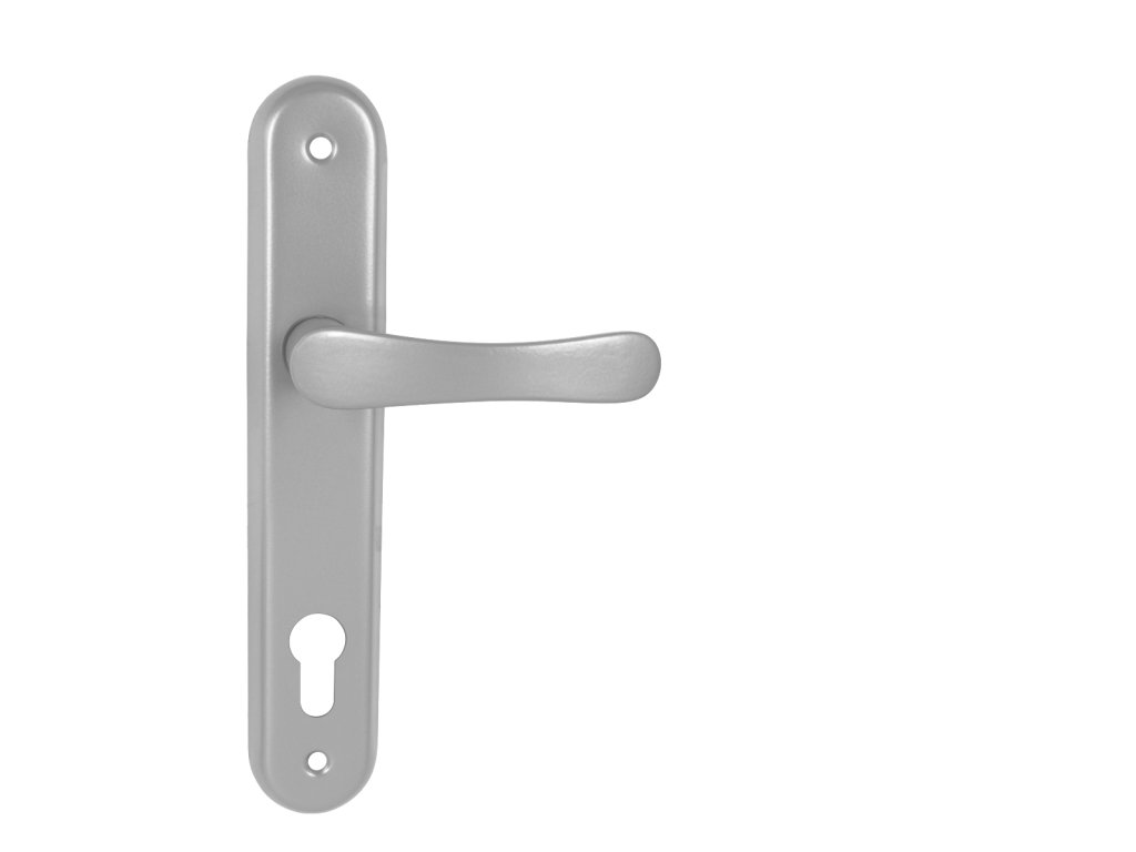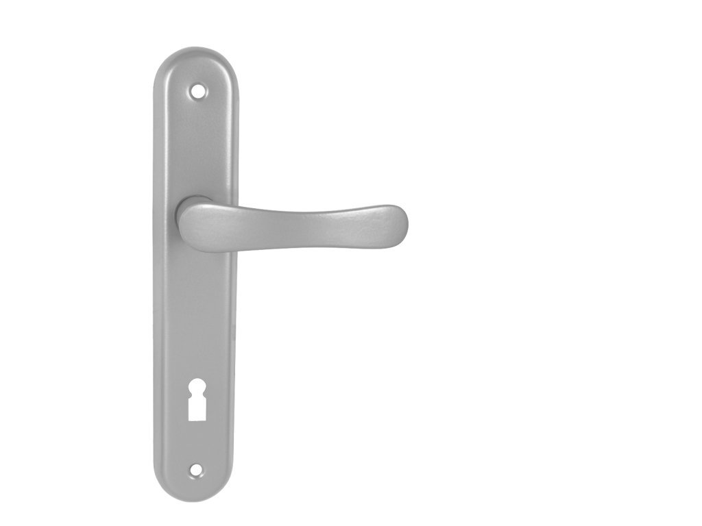 Štítová klika na interiérové dveře s oválným štítem je vyrobena z hliníku a je povrchově upravena. Oválný štít má rozměry 42 mm x 230 mm a klika neobsahuje vratný mechanismus.