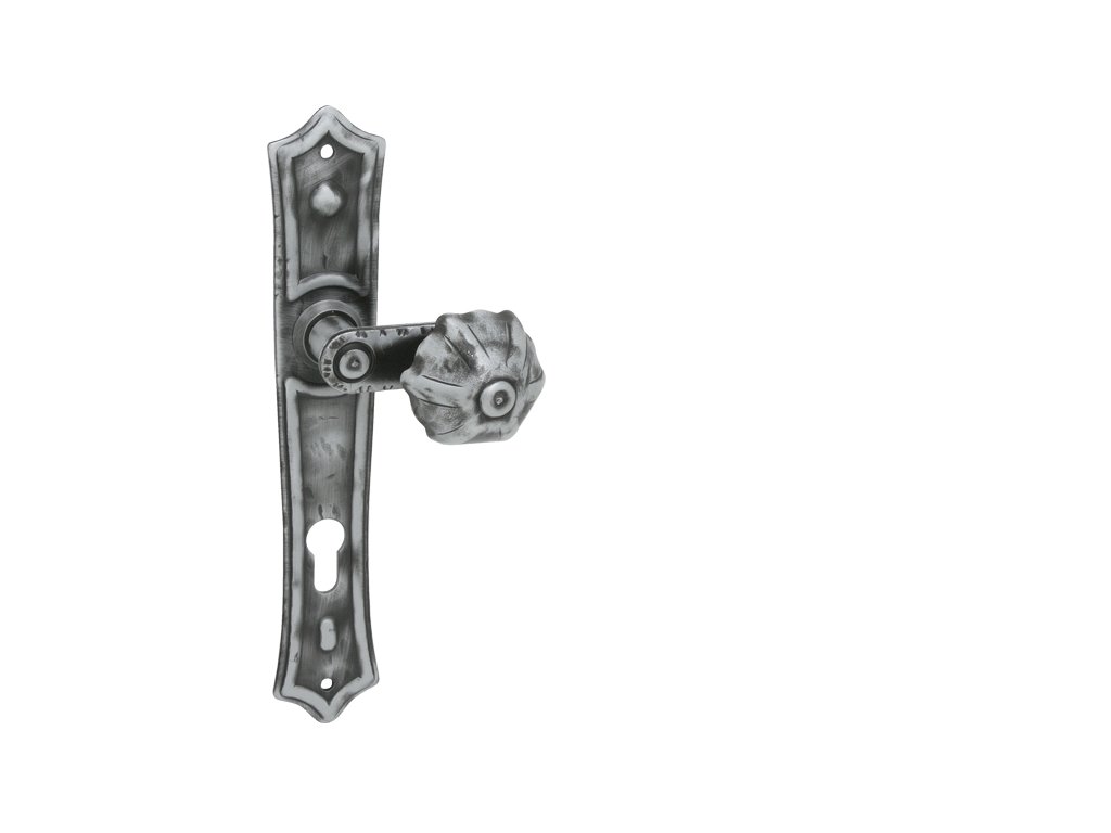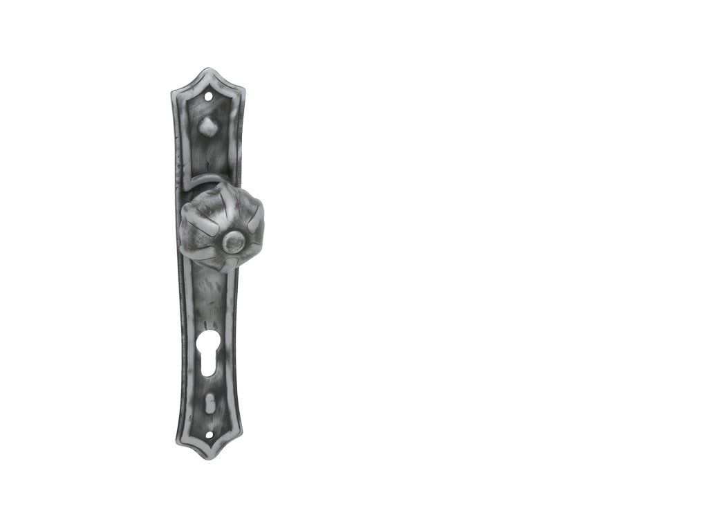 Štítová klika na interiérové dveře s kovaným štítem je vyrobena z kovaného železa a je povrchově upravena.