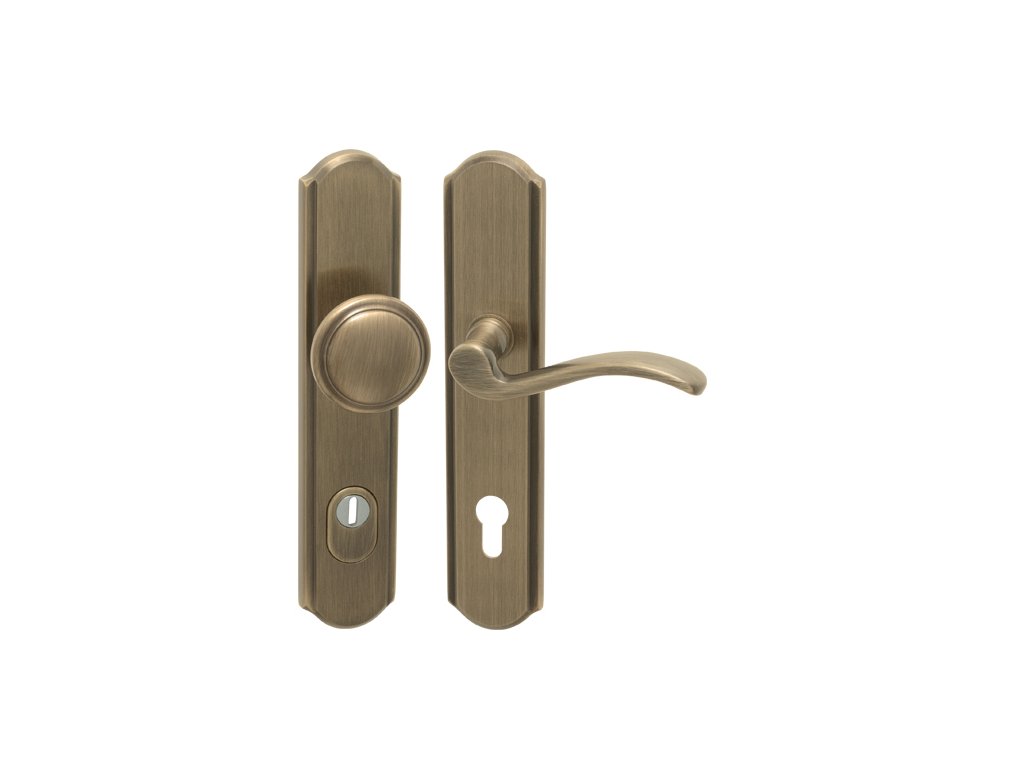 Štítová klika na vchodové a bezpečnostní dveře se zpevněným rustikálním štítem s překrytím cylindrické vložky je vyrobena z materiálů vysoké kvality - mosaz a je povrchově upravena.