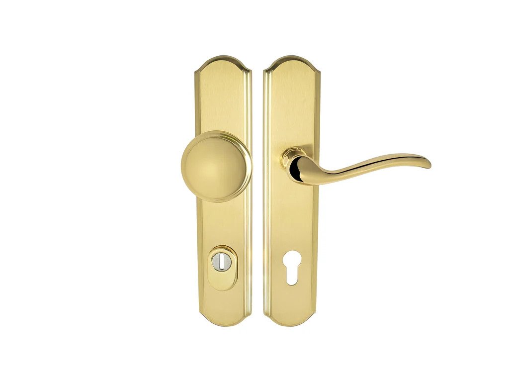 Štítová klika na vchodové a bezpečnostní dveře se zpevněným rustikálním štítem s překrytím cylindrické vložky je vyrobená z materiálů vysoké kvality – mosaz a je povrchově upravená.