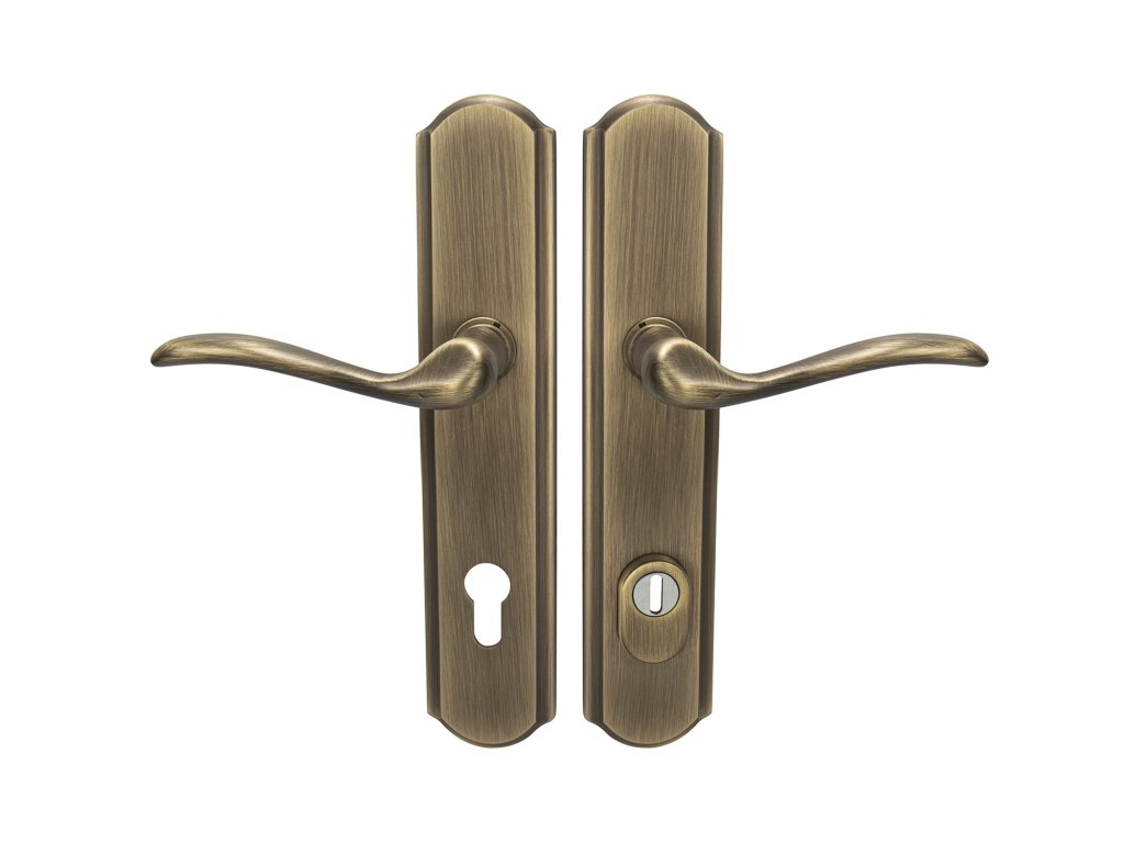 Štítová klika na vchodové a bezpečnostní dveře se zpevněným rustikálním štítem s překrytím cylindrické vložky je vyrobená z materiálů vysoké kvality – mosaz a je povrchově upravená.