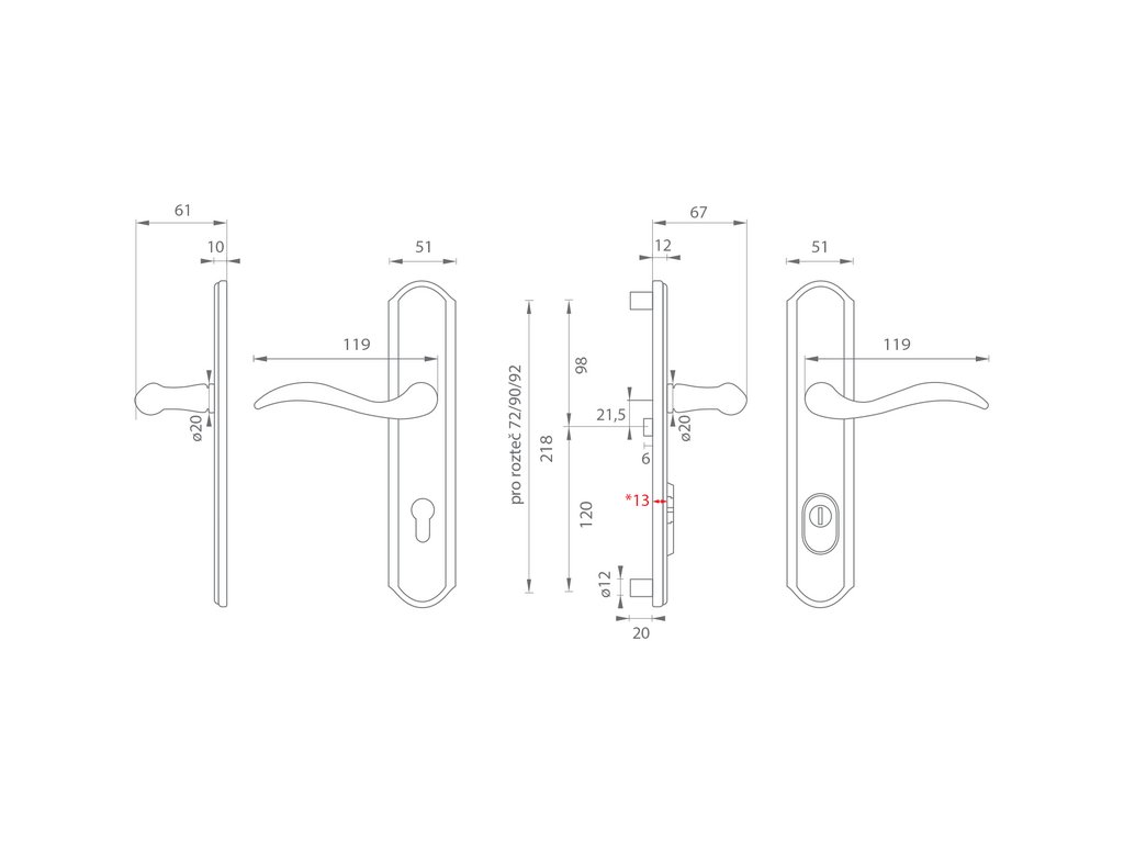 U zpevněného kování je třeba znát vzdálenost mezi osou kliky a osou klíče (rozteč). Standardní vzdálenost je 72, 90 nebo 92 mm. Kování je standardem pro tloušťku dveří od 38 mm do 50 mm.