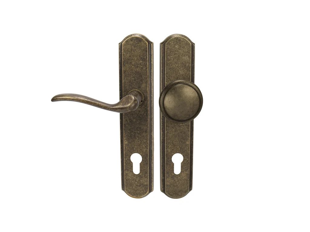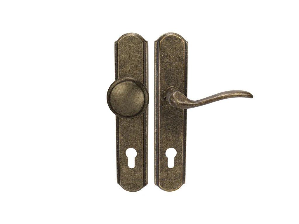 Štítová klika na vchodové a bezpečnostní dveře se zpevněným rustikálním štítem bez překrytí cylindrické vložky je vyrobená z materiálů vysoké kvality – mosaz a je povrchově upravená.
