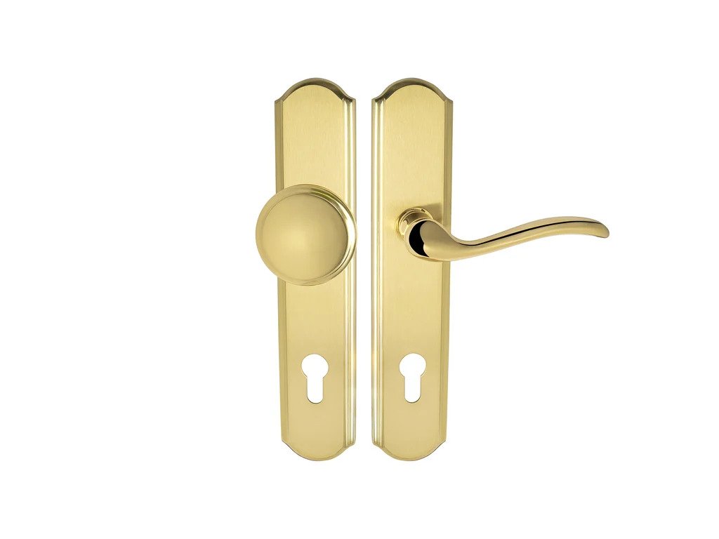 Štítová klika na vchodové a bezpečnostní dveře se zpevněným rustikálním štítem bez překrytí cylindrické vložky je vyrobená z materiálů vysoké kvality – mosaz a je povrchově upravená.