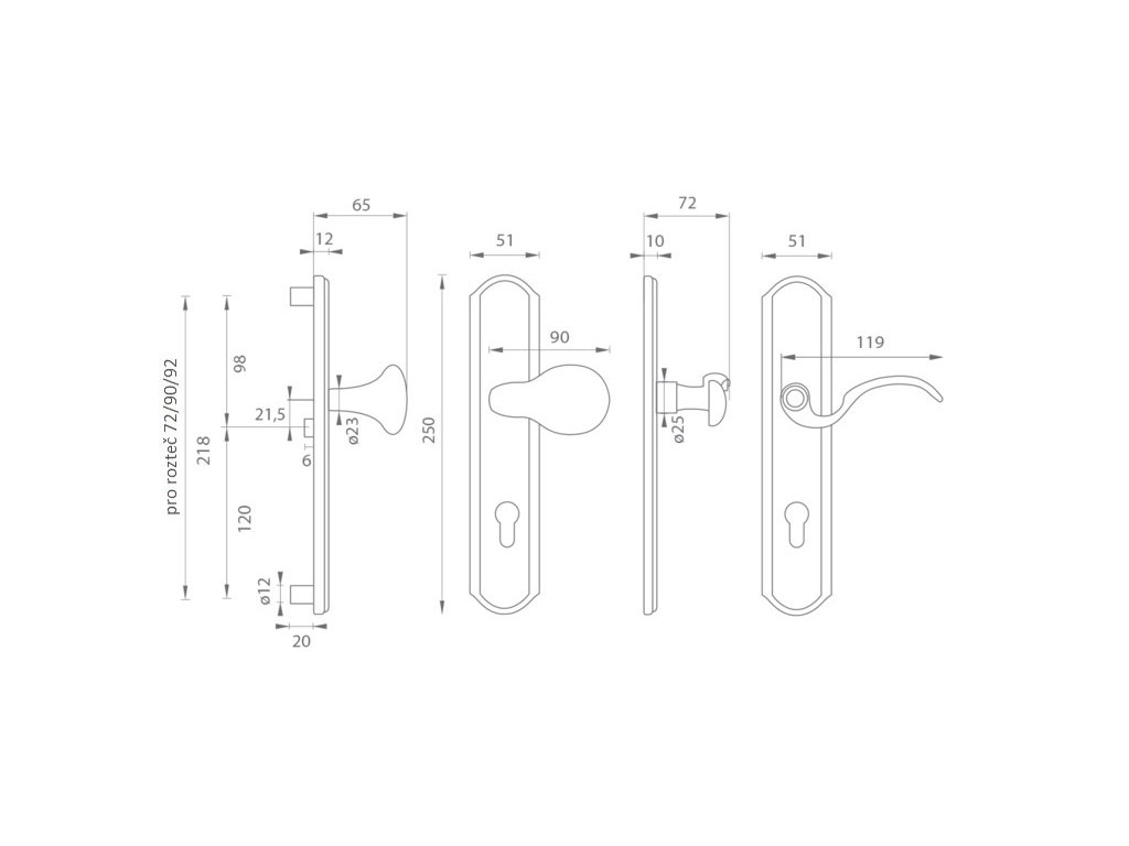 U zpevněného kování je třeba znát vzdálenost mezi osou kliky a osou klíče (rozteč). Standardní vzdálenost je 72, 90 nebo 92 mm. Kování je standardem pro tloušťku dveří od 38 mm do 50 mm.