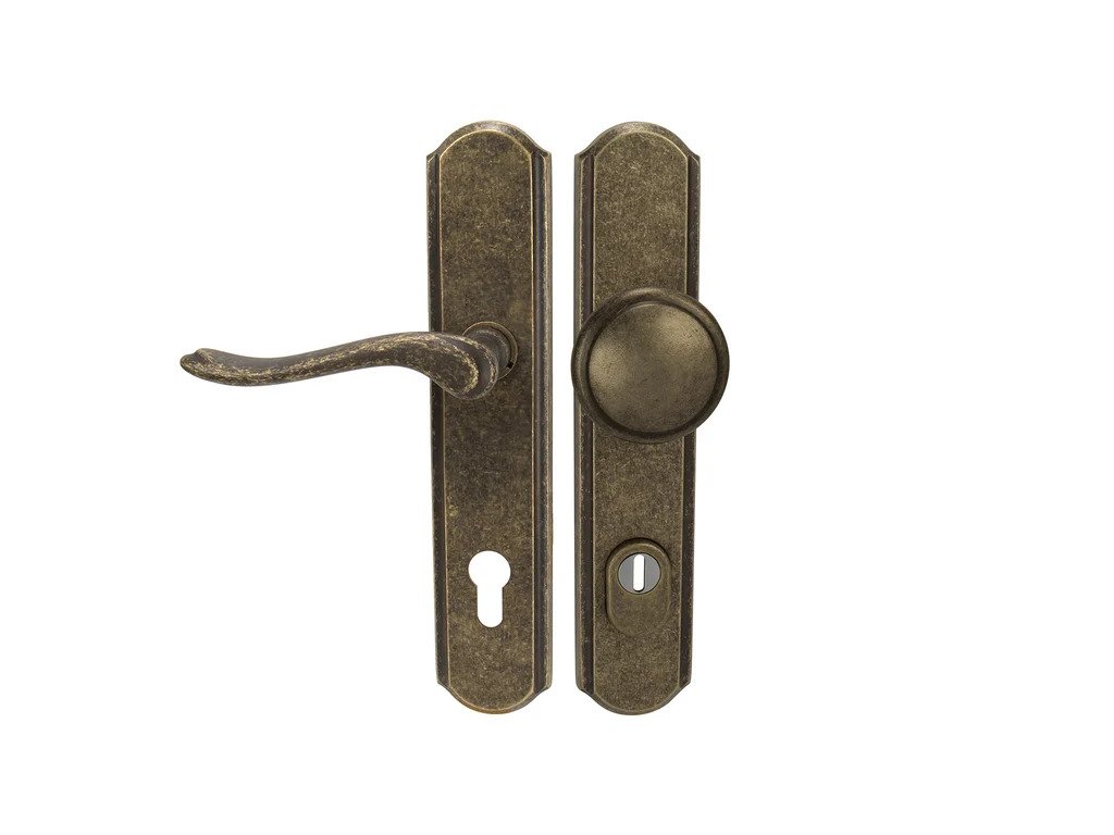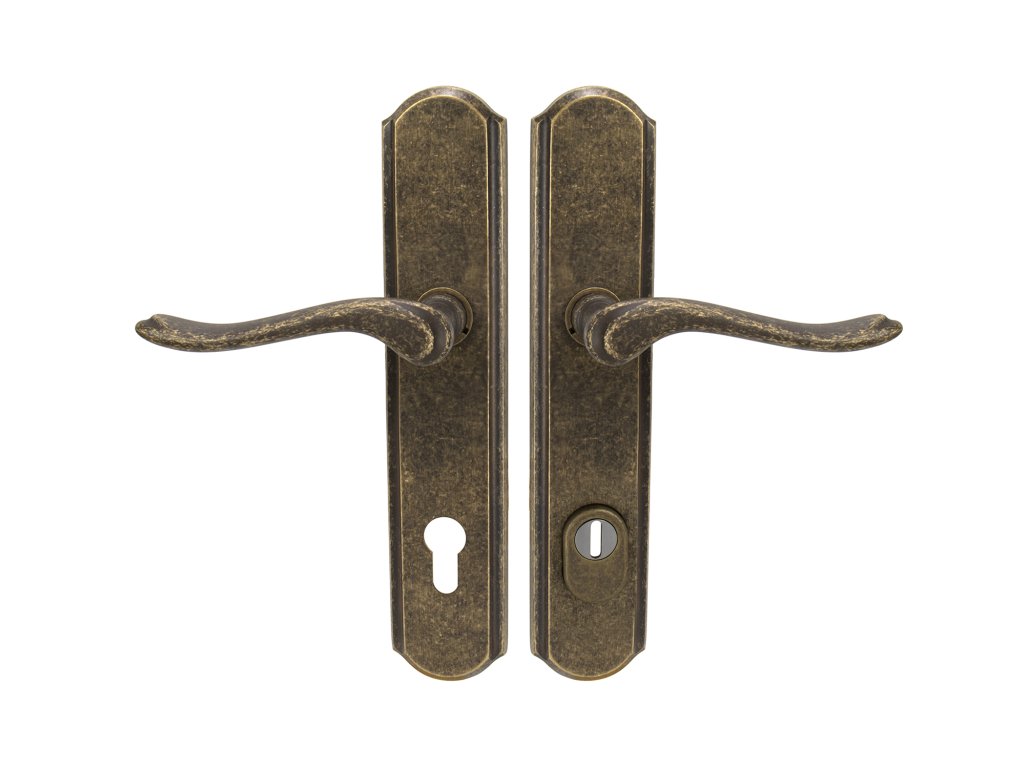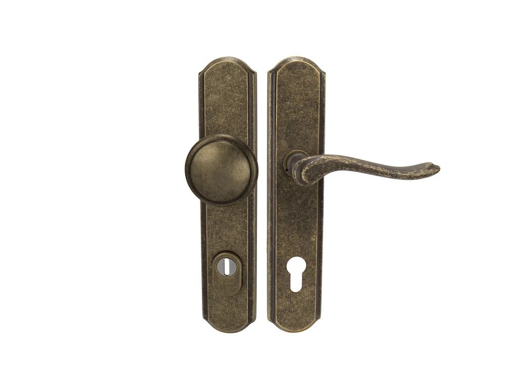 Štítová klika na vchodové a bezpečnostní dveře se zpevněným rustikálním štítem s překrytím cylindrické vložky je vyrobená z materiálů vysoké kvality – mosaz a je povrchově upravená.