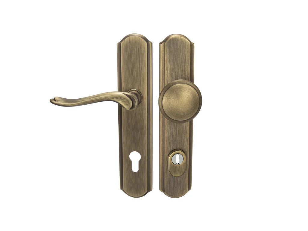 Štítová klika na vchodové a bezpečnostní dveře se zpevněným rustikálním štítem s překrytím cylindrické vložky je vyrobená z materiálů vysoké kvality – mosaz a je povrchově upravená.