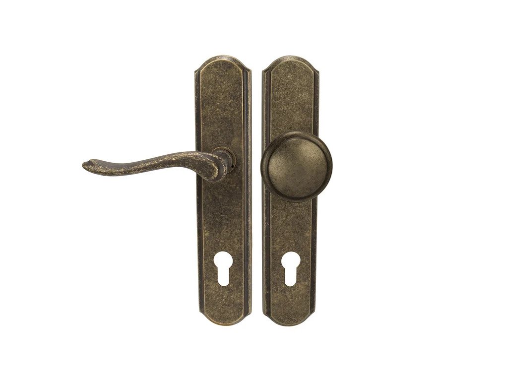 Štítová klika na vchodové a bezpečnostní dveře se zpevněným rustikálním štítem bez překrytí cylindrické vložky je vyrobená z materiálů vysoké kvality – mosaz a je povrchově upravená.