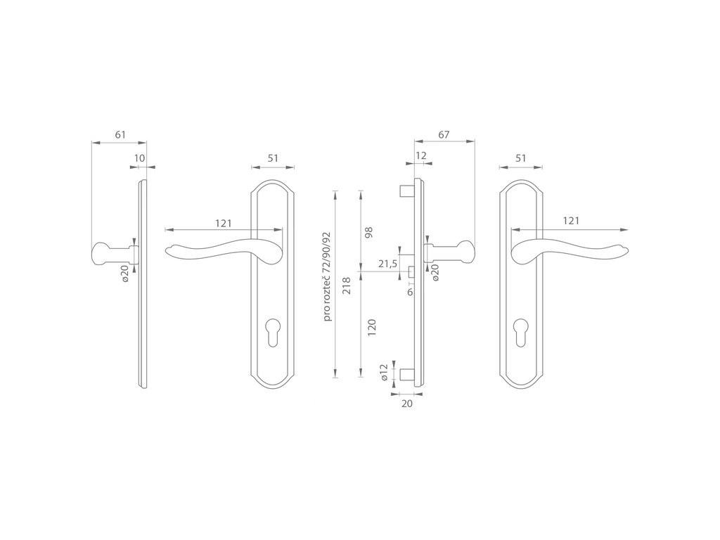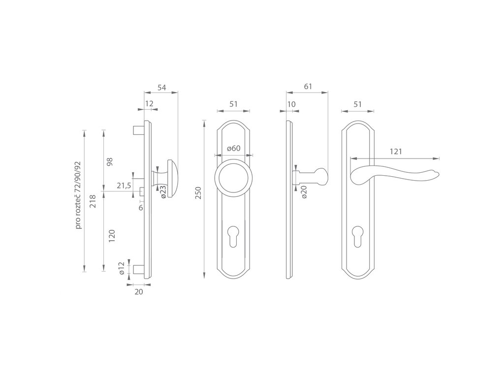 U zpevněného kování je třeba znát vzdálenost mezi osou kliky a osou klíče (rozteč). Standardní vzdálenost je 72, 90 nebo 92 mm. Kování je standardem pro tloušťku dveří od 38 mm do 50 mm.