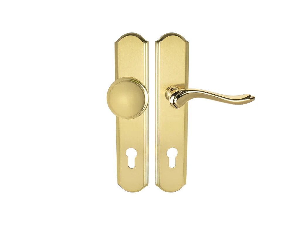 Štítová klika na vchodové a bezpečnostní dveře se zpevněným rustikálním štítem bez překrytí cylindrické vložky je vyrobená z materiálů vysoké kvality – mosaz a je povrchově upravená.