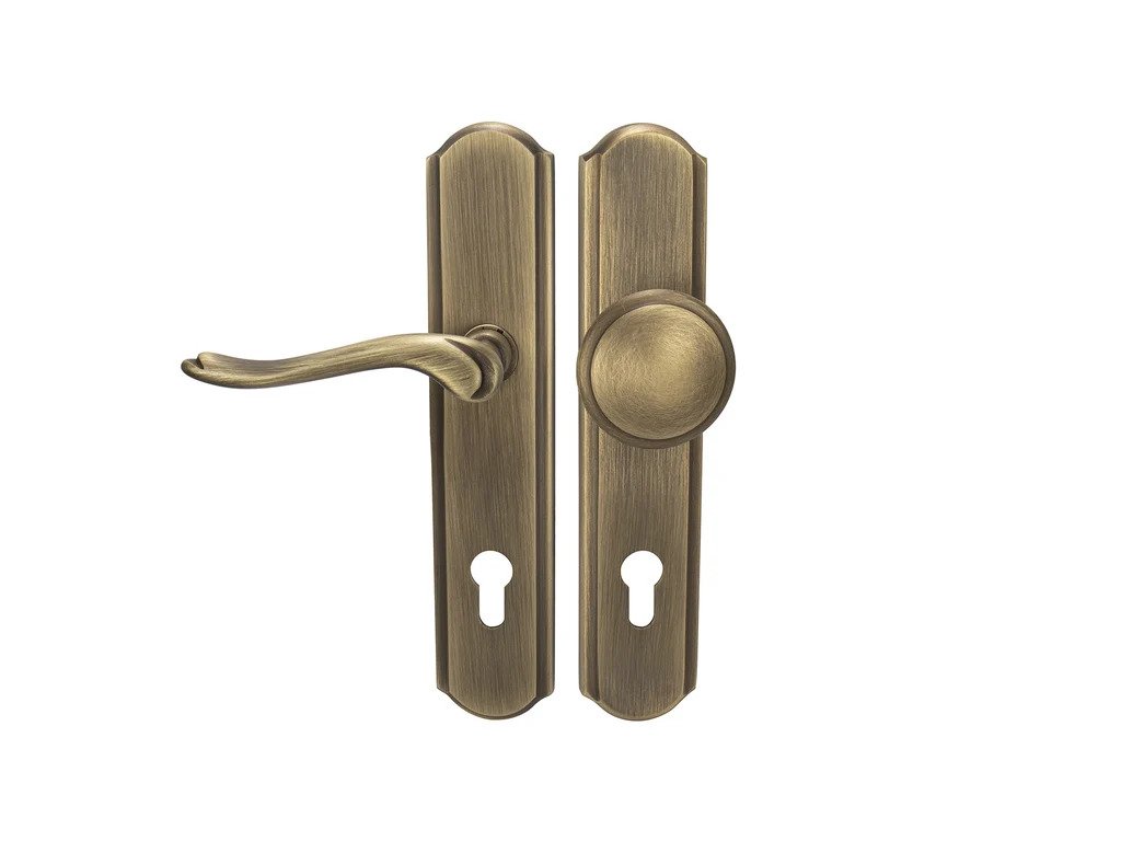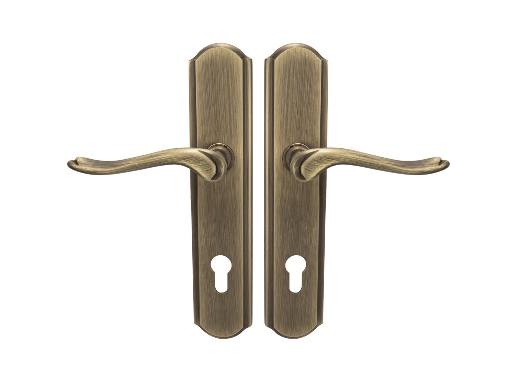 Štítová klika na vchodové a bezpečnostní dveře se zpevněným rustikálním štítem bez překrytí cylindrické vložky je vyrobená z materiálů vysoké kvality – mosaz a je povrchově upravená.