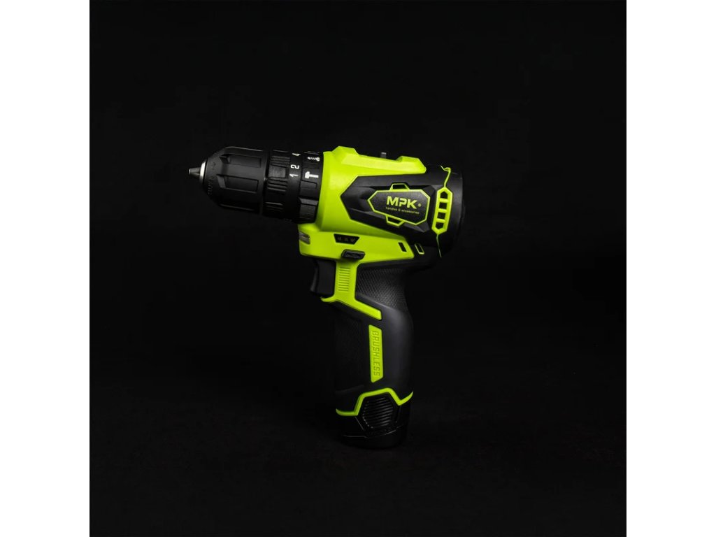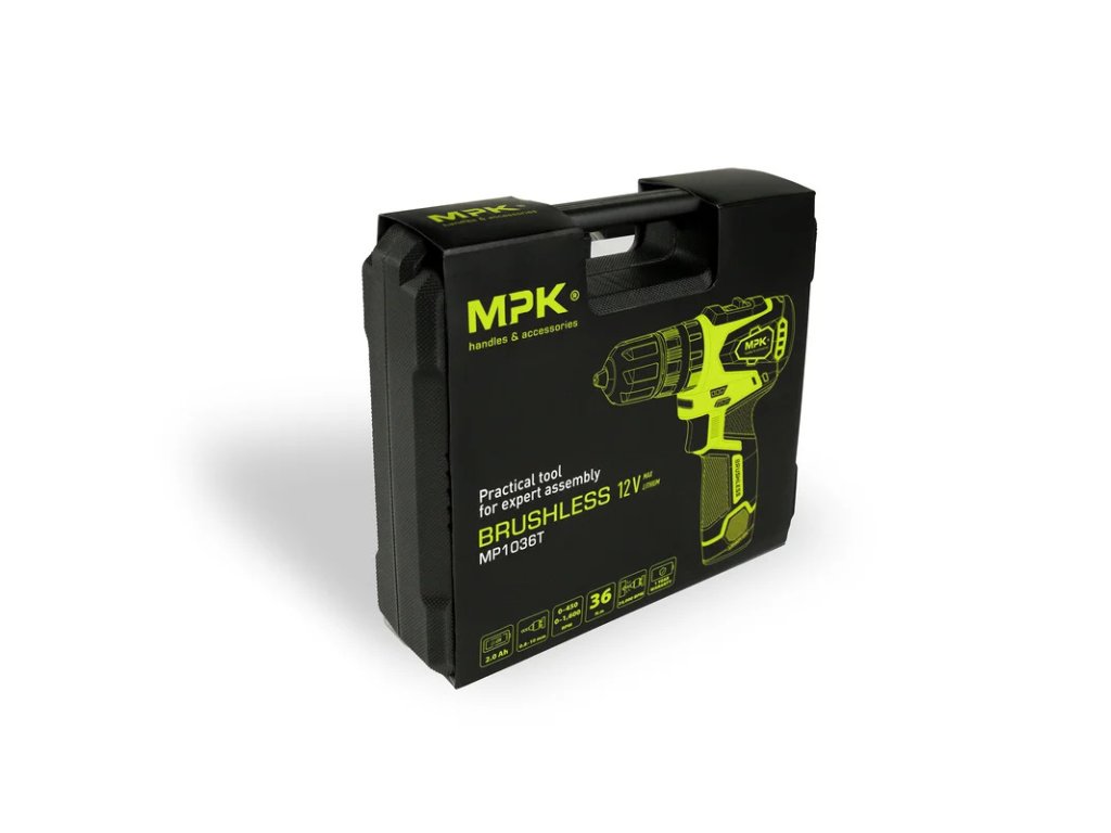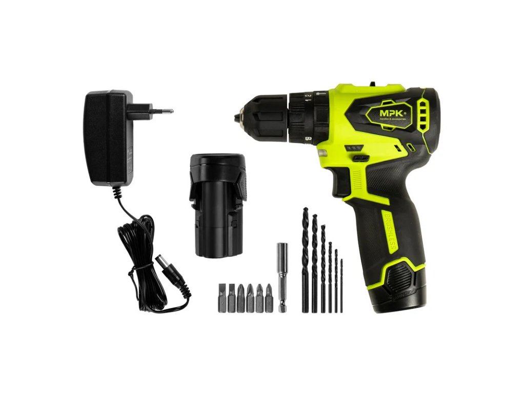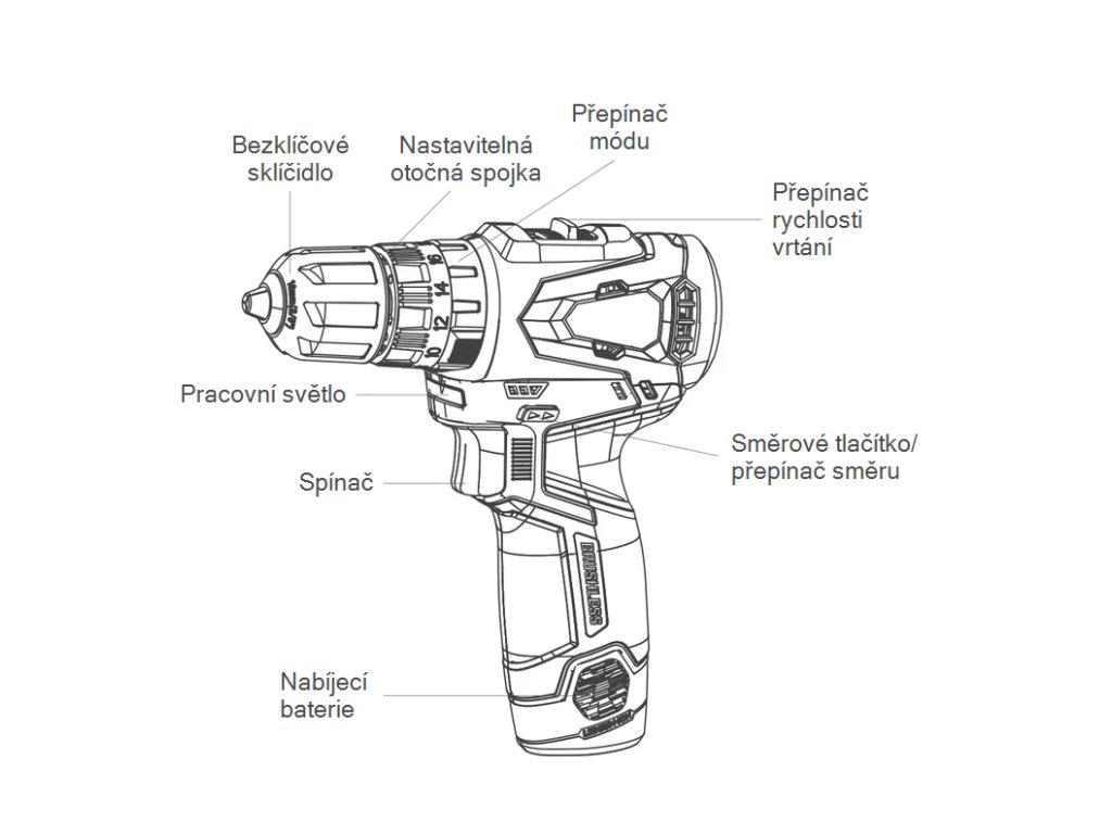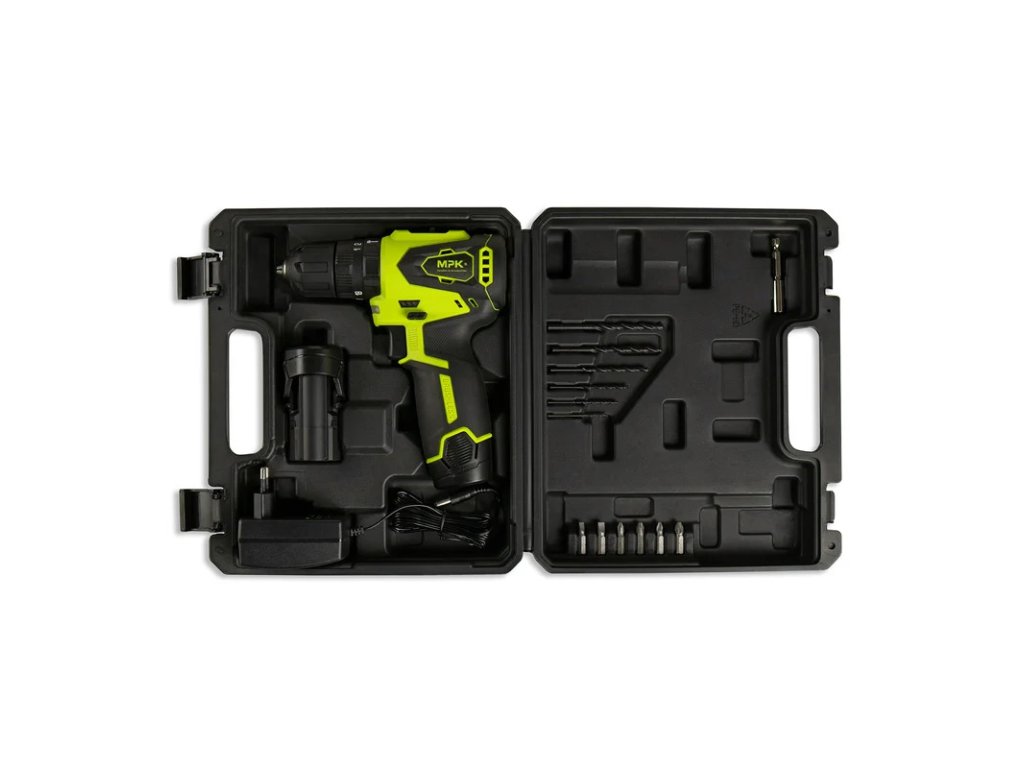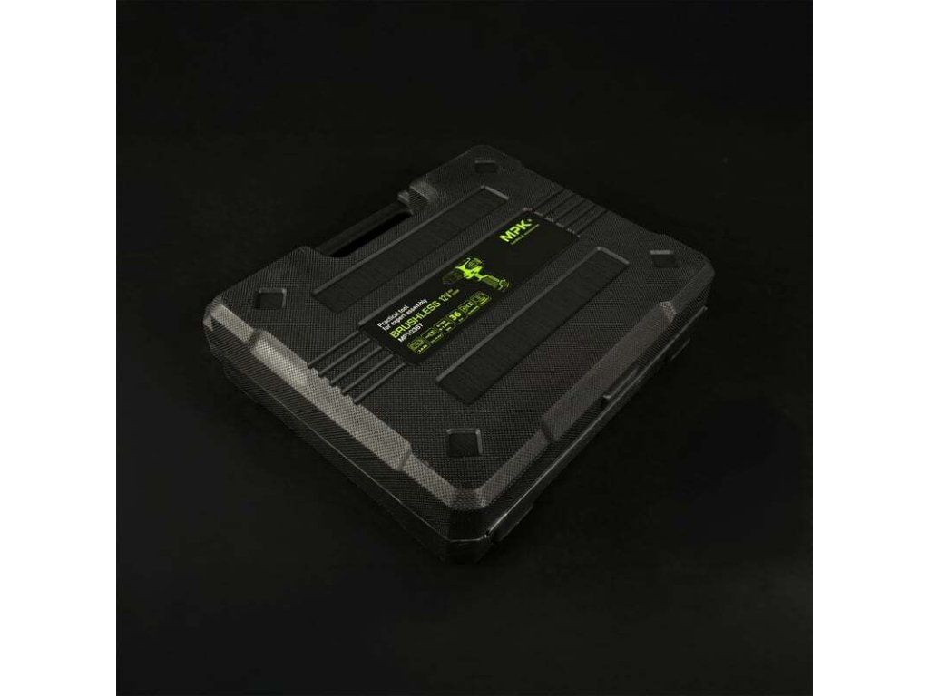 Vrtačka je dodávaná v praktickém plastovém kufříku, ve kterém naleznete sadu vrtáků do železa a šroubovací bity s adaptérem. Vrtačka je dodávaná se dvěma Li-Ion akumulátory, které se pomocí přiložené nabíječky nabijí na plný výkon za 1 hodinu. Vrtačka má výkonné LED osvětlení prostoru vrtání.