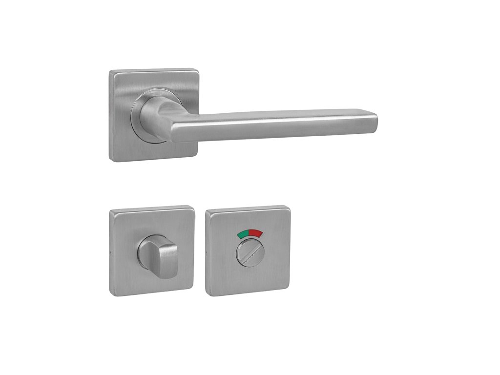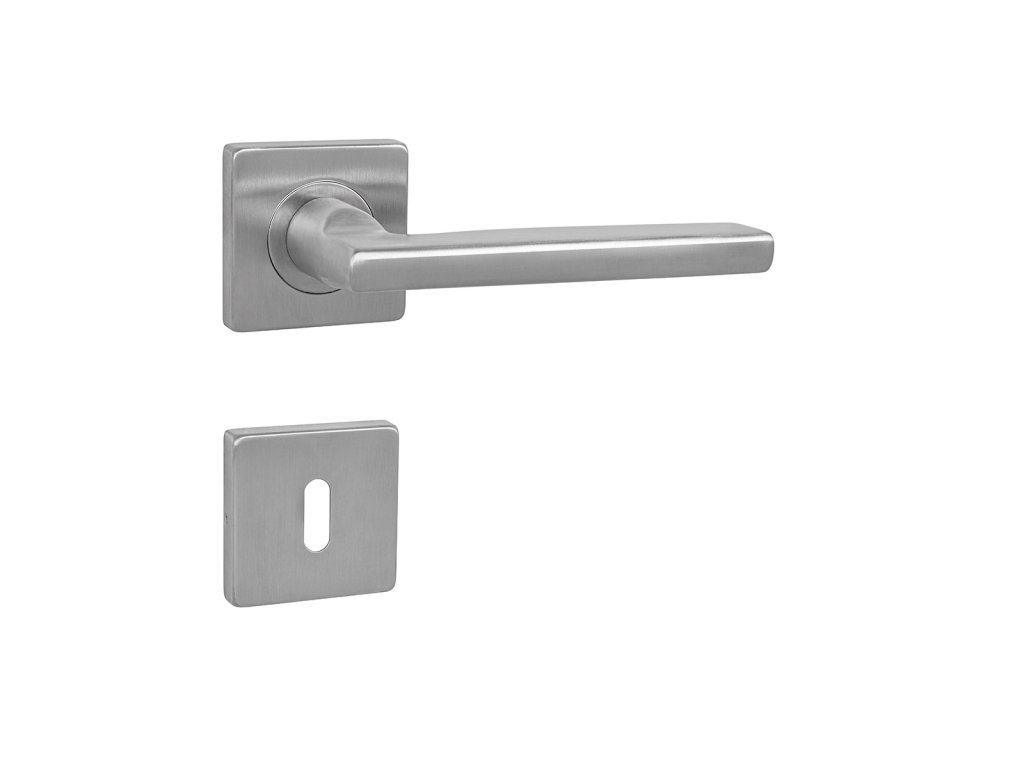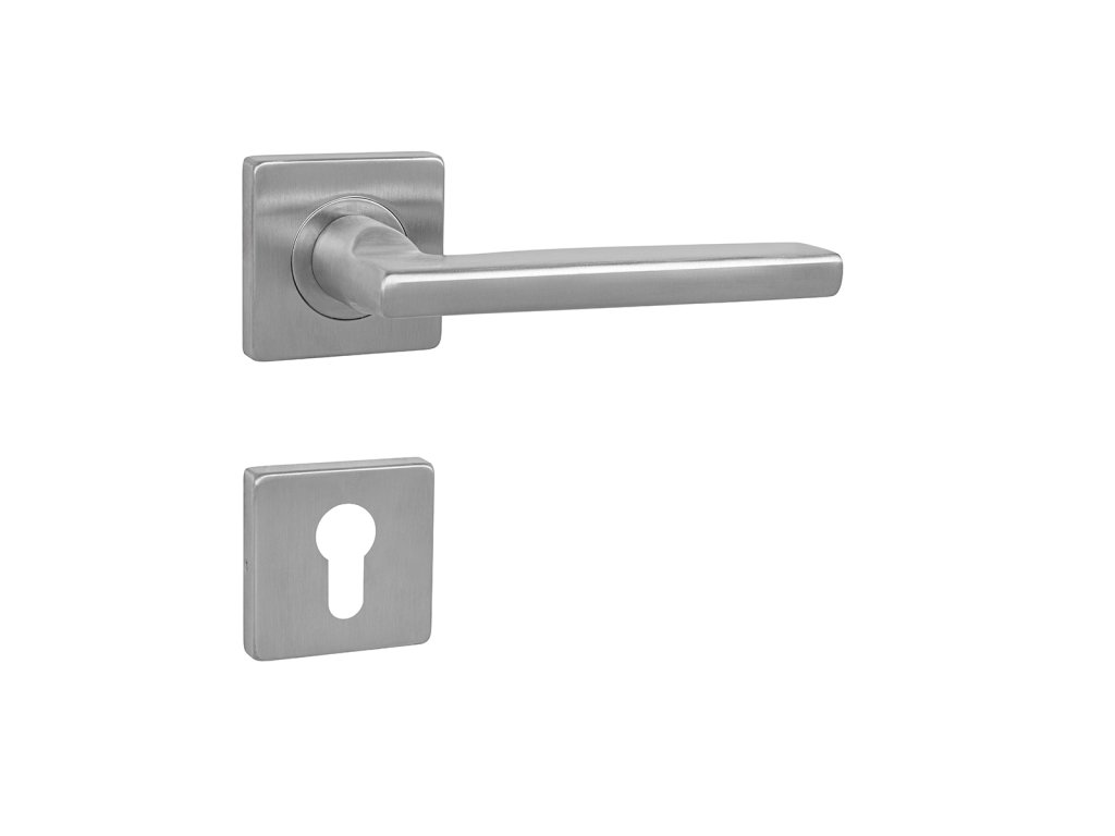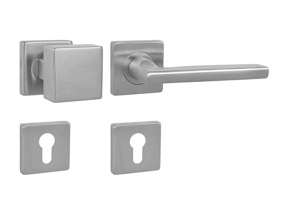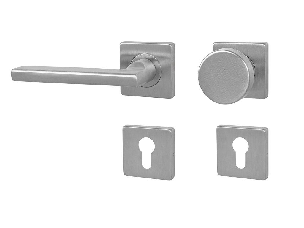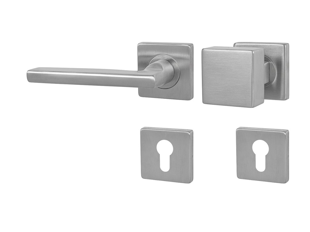 Rozetová klika na interiérové dveře s hranatou rozetou je vyrobená z vysoce kvalitní nerezavějící oceli, známé jako nerez a je povrchově upravená. Rozeta má rozměry 54 mm x 54 mm a tloušťku 9 mm. Je barevně stabilní a odolná vůči opotřebení. Kování je testované podle normy ČSN EN 1906:2012 na 200 000 cyklů.