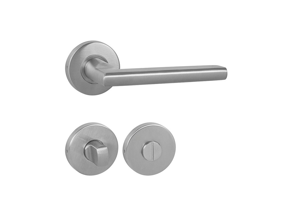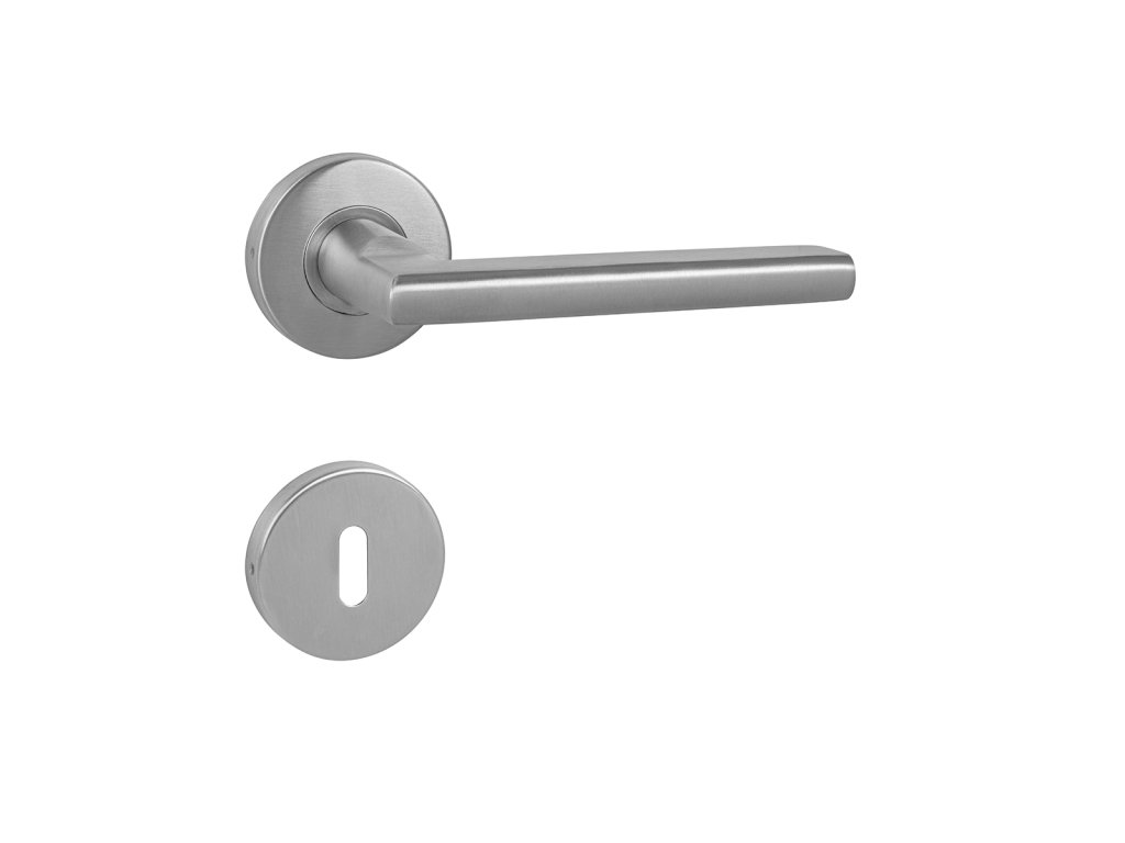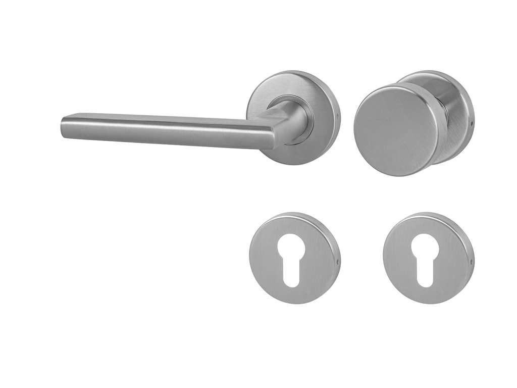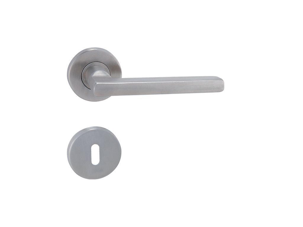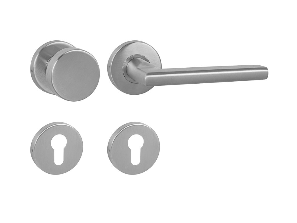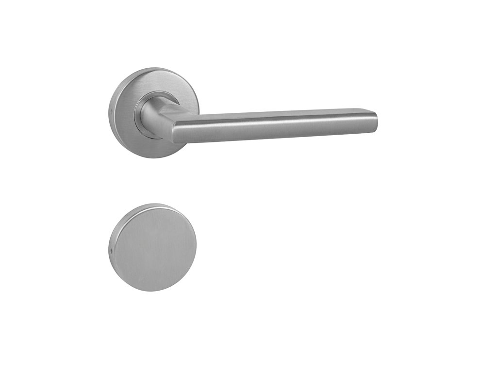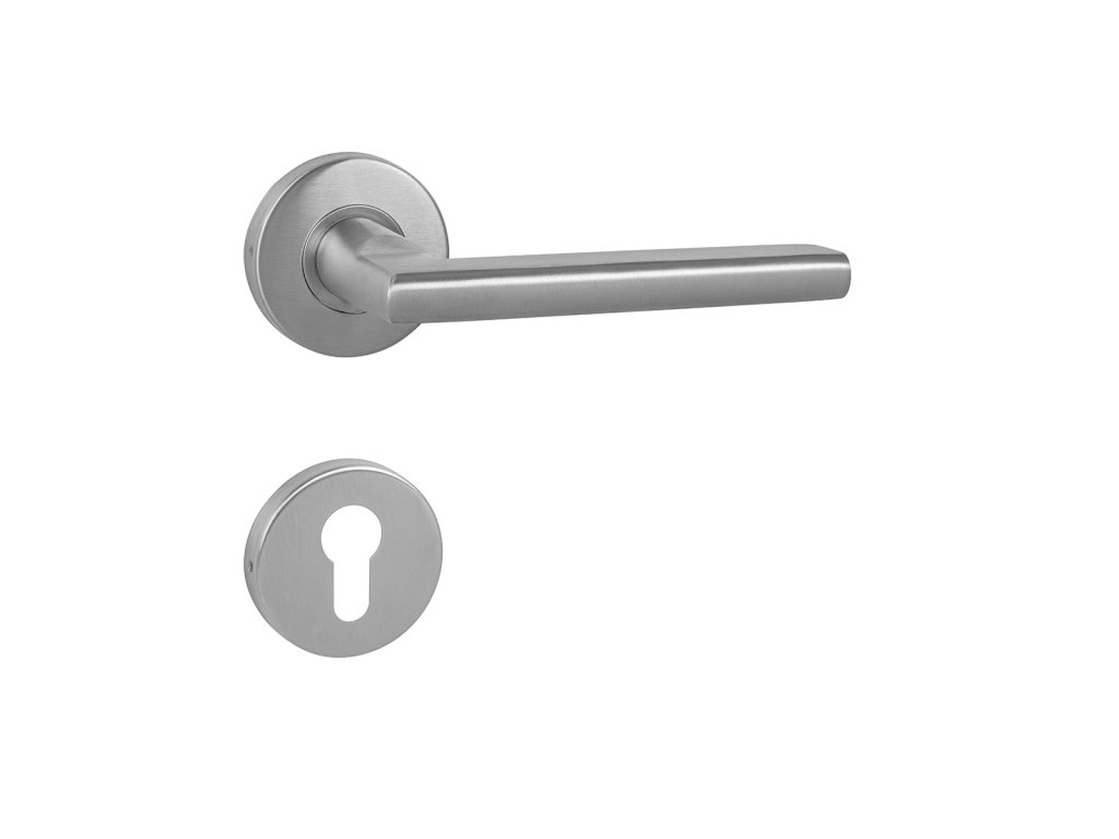 Rozetová klika na interiérové dveře s kulatou rozetou z kvalitní nerezavějící oceli, známé jako nerez a je povrchově upravena. Rozeta má průměr 54 mm a tloušťku 9 mm. Je barevně stabilní a odolná vůči opotřebení. Kování je testováno dle normy ČSN EN 1906: 2012 na 200 000 cyklů.