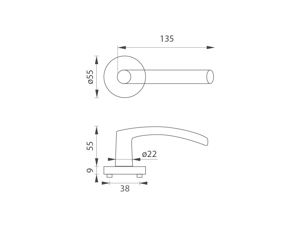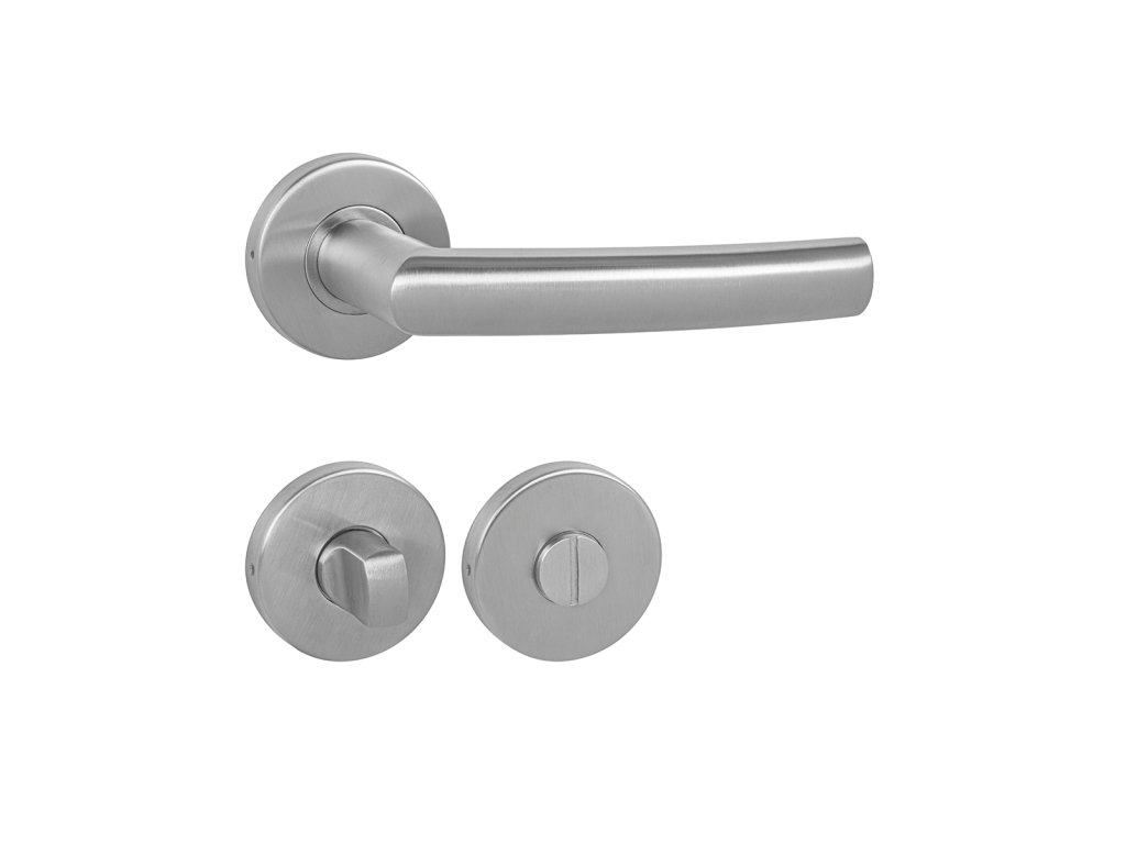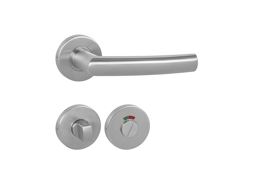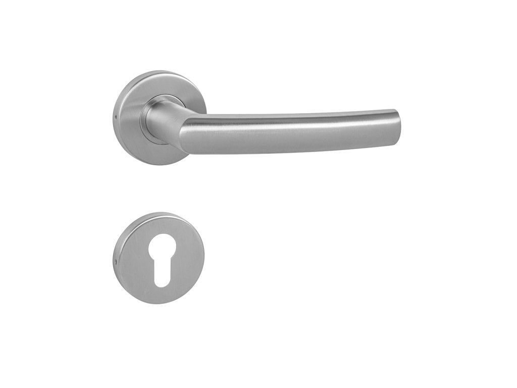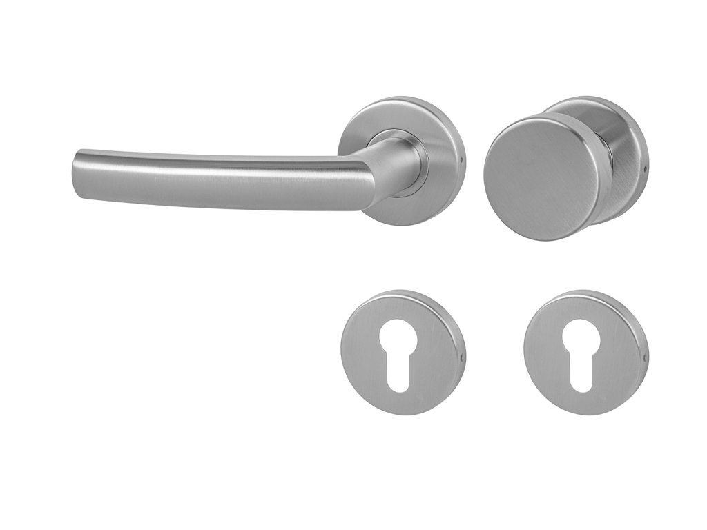 Rozetová klika na interiérové dveře s kulatou rozetou z vysoce kvalitní nerezavějící oceli, známé jako nerez a je povrchově upravena. Rozeta má průměr 54 mm a tloušťku 9 mm. Je barevně stabilní a odolná vůči opotřebení. Kování je testované podle normy ČSN EN 1906:2012 na 200 000 cyklů.