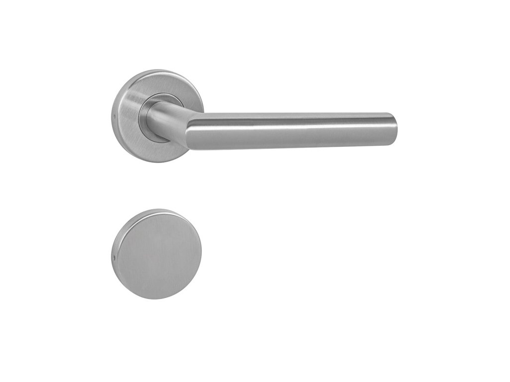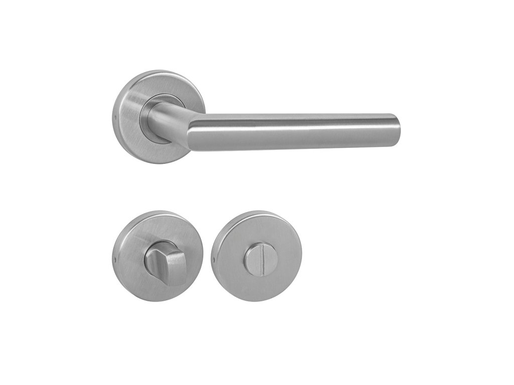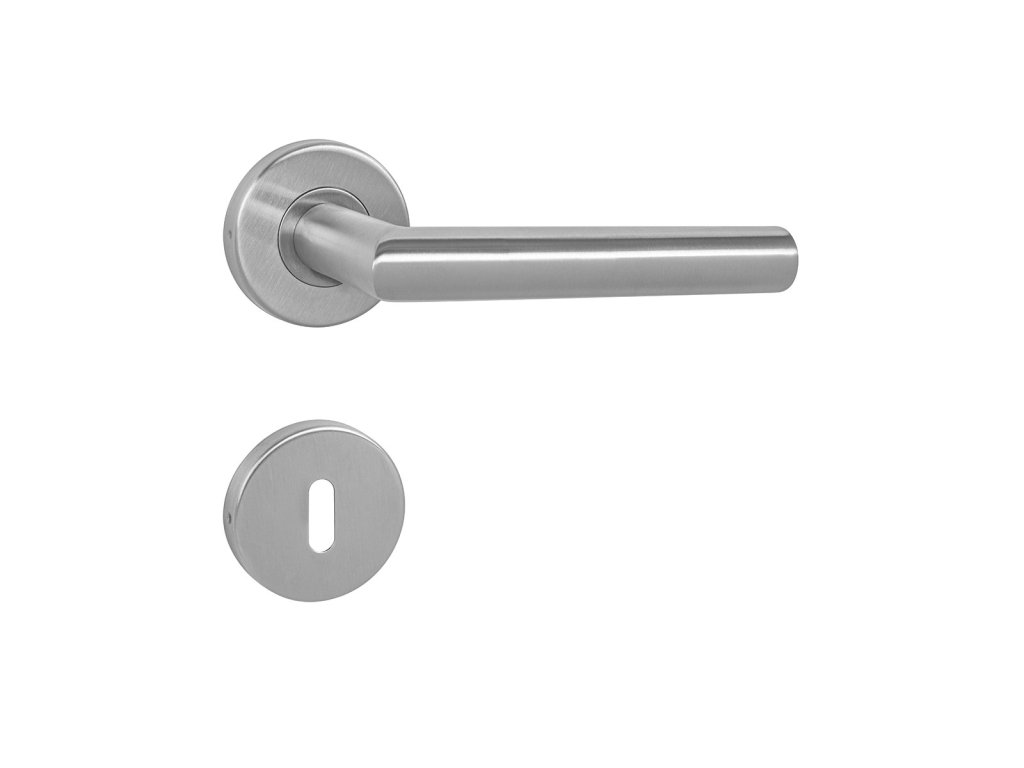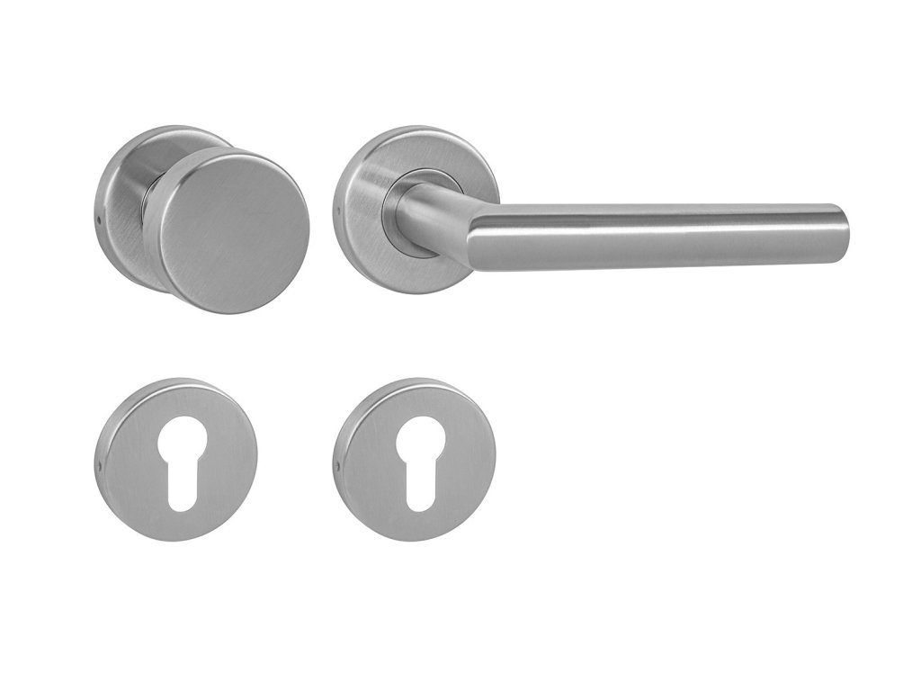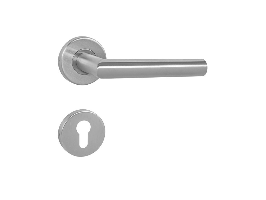 Rozetová klika na interiérové dveře s kulatou rozetou z kvalitní nerezavějící oceli, známé jako nerez a je povrchově upravena. Rozeta má průměr 54 mm a tloušťku 9 mm. Je barevně stabilní a odolná vůči opotřebení. Kování je testováno dle normy ČSN EN 1906: 2012 na 200 000 cyklů.