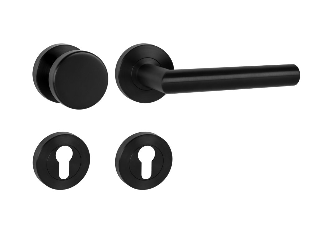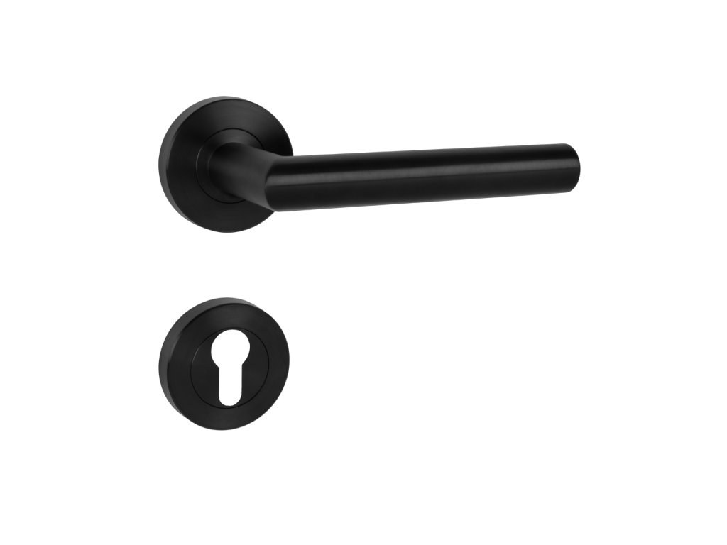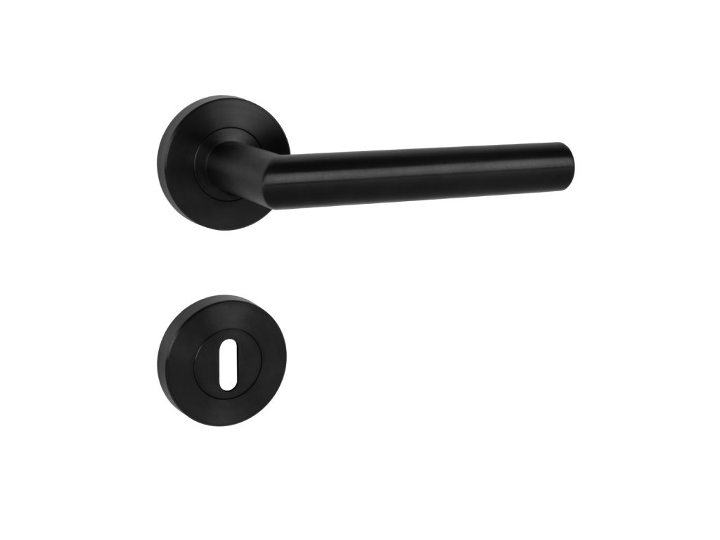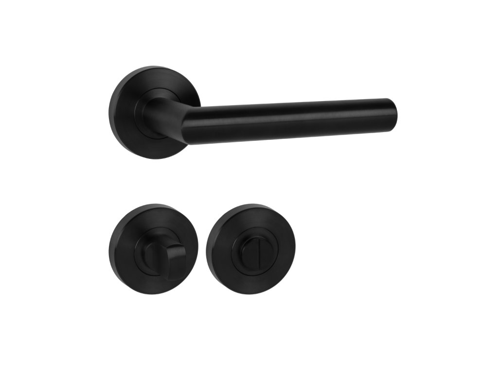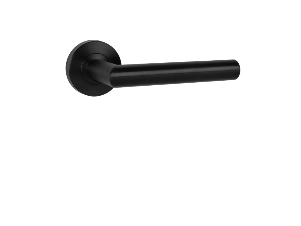 Rozetová klika na interiérové dveře s kulatou šroubovací rozetou představuje kombinaci funkčnosti a elegance pro prostředí s vysokou zátěží. Je vyrobena z vysoce kvalitní nerezavějící oceli, známé jako nerez a je povrchově upravená. Černý matný povrch je nanesen vysoce kvalitní technologií pokovování PVD, na kterou se vztahuje prodloužená 10letá záruka. Krycí rozety jsou upevněny vnitřním závitem bez viditelných spojů, který zaručuje extrémně pevný spoj a hladké přilnutí k povrchu dveří. Ergonomický úchop se seříznutou hranou poskytuje pohodlí při každém doteku. Klika je díky své robustní konstrukci obzvlášť vhodná pro prostředí s vysokou frekvencí pohybu osob, jako jsou kanceláře, veřejné budovy, nemocnice, čerpací stanice apod.