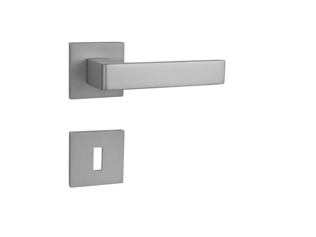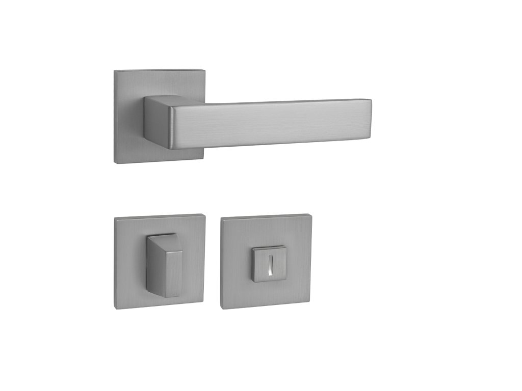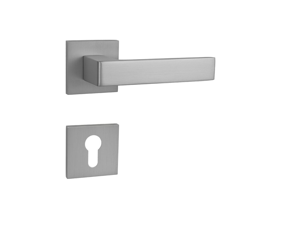 Rozetová klika na interiérové dveře s hranatou rozetou je vyrobena odléváním z kvalitních slitin zinku a hliníku a je povrchově upravena. Klika je povrchově upravována galvanizací a vyznačuje se vysokou odolností proti oděru. Kování je testováno na 100 000 cyklů.