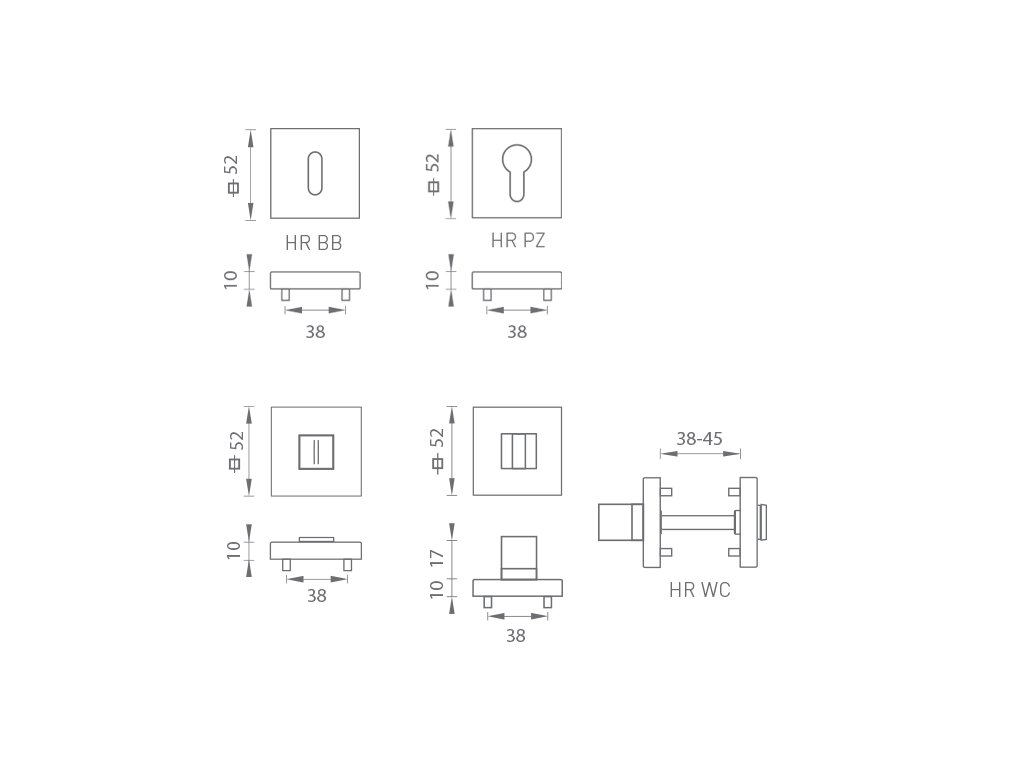 Hranatá rozeta je vyrobena ze zamaku a hliníku a je povrchově upravena. Rozeta má rozměry 52 mm x 52 mm, tloušťku 10 mm a oválný otvor pro interiérový klíč (BB), otvor pro cylindrickou vložku (PZ) nebo WC set s vmontovaným klíčem. Balení obsahuje 2 kusy rozet (pár) a rozety WC jsou v balení jako set.