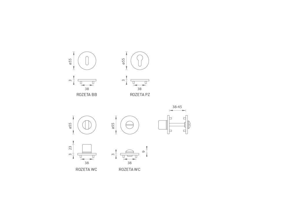 Kulatá rozeta je vyrobena z vysoce kvalitní nerezavějící oceli, známé jako nerez a je povrchově upravena. Rozeta má průměr 55 mm, tloušťku jen 3 mm a oválný otvor pro interiérový klíč (BB), otvor pro cylindrickou vložku (PZ) nebo WC set s vmontovaným klíčem. Balení obsahuje 2 kusy rozet (pár) a rozety WC jsou v balení jako set.
