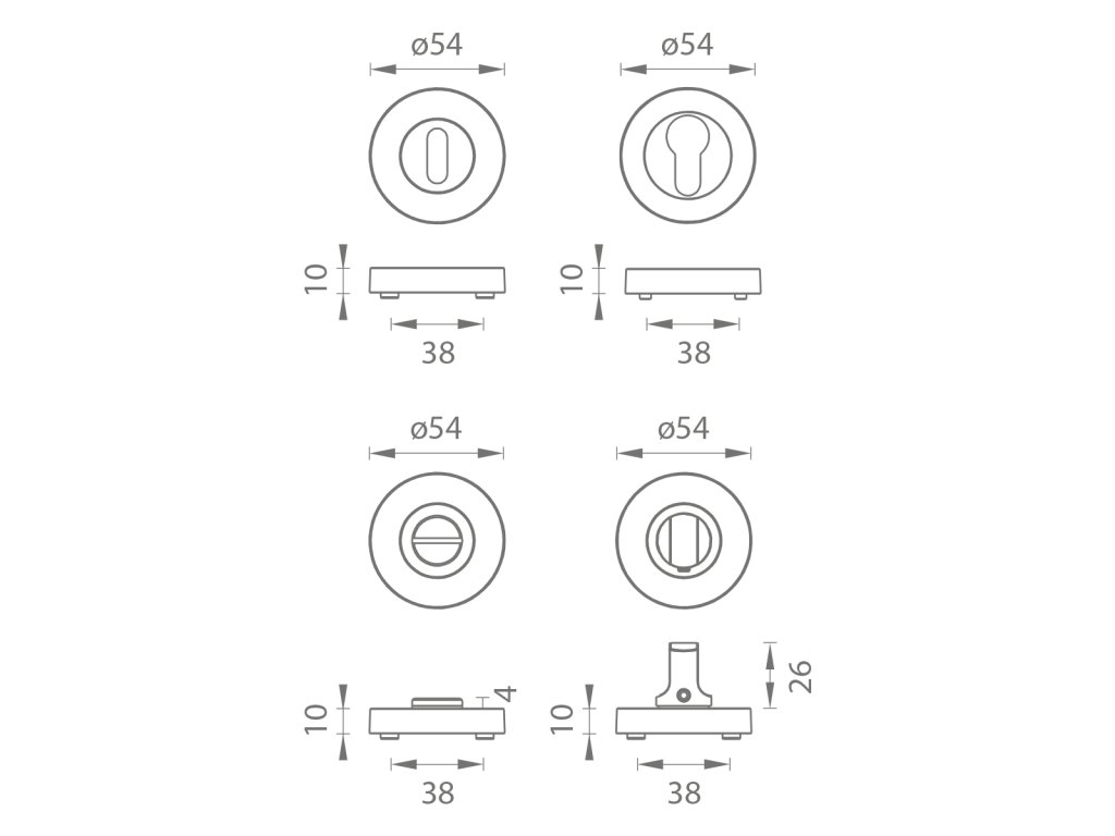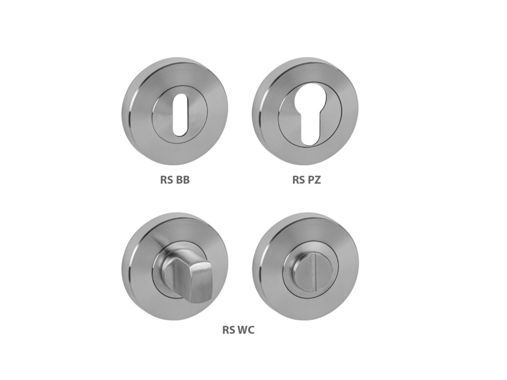 Rozeta má oválný otvor pro interiérový klíč (BB), otvor pro cylindrickou vložku (PZ) nebo WC set s vmontovaným klíčem.