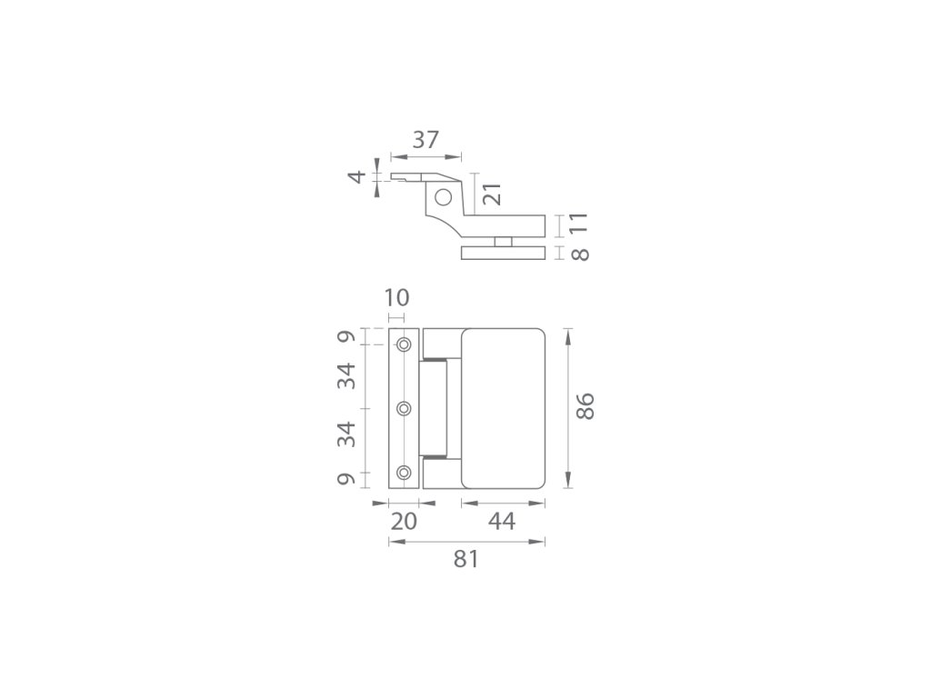 Vhodný pro tloušťku skla 8 – 10 mm. Maximální nosnost pantů je 45 kg. Maximální šířka skla je 865 mm.