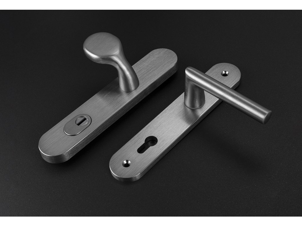 Kování je vyrobeno z odolného hliníku, navrhnuté s ohledem na dlouhodobé zatížení a spolehlivost. Dostupné je ve dvou moderních povrchových úpravách F5 - Černá matná a F9 - Nerez elox a ve variantách madlo/klika anebo klika/klika.