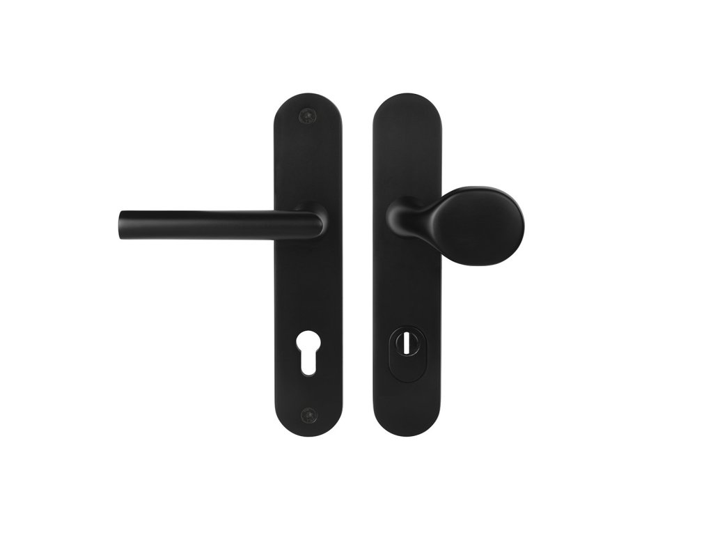 Kování je vyrobeno z odolného hliníku, navrhnuté s ohledem na dlouhodobé zatížení a spolehlivost. Dostupné je ve dvou moderních povrchových úpravách F5 - Černá matná a F9 - Nerez elox a ve variantách madlo/klika anebo klika/klika.