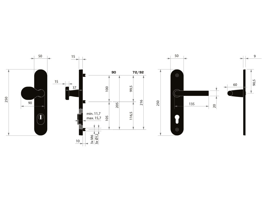 Kování se upevňuje třemi bezpečnostními šrouby, přičemž středový šroub je skrytý pod krytem. Model je dodávaný v roztečích 72 mm, 90 mm a 92 mm, takže se lehce přizpůsobí různým typům dveří.