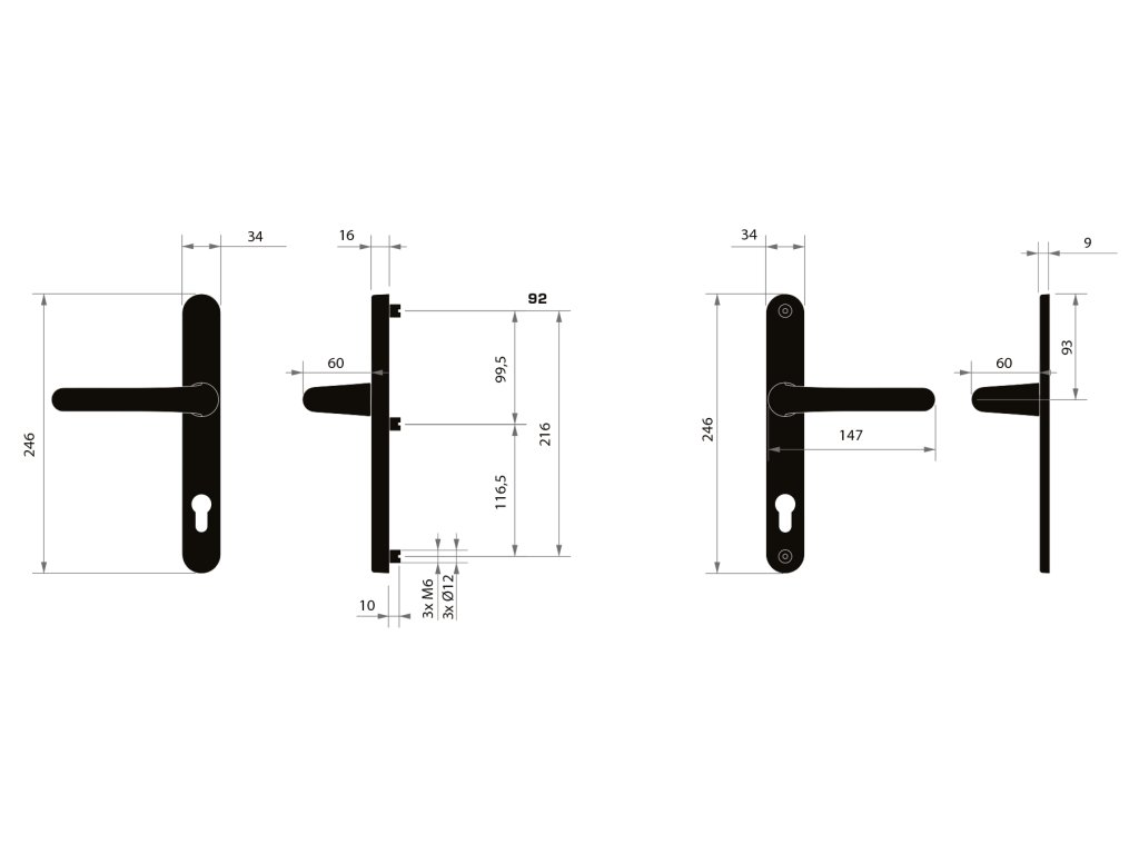 Kování se upevňuje třemi bezpečnostními šrouby, přičemž středový šroub je skrytý pod krytem. Model je dodávaný v rozteči 92 mm.