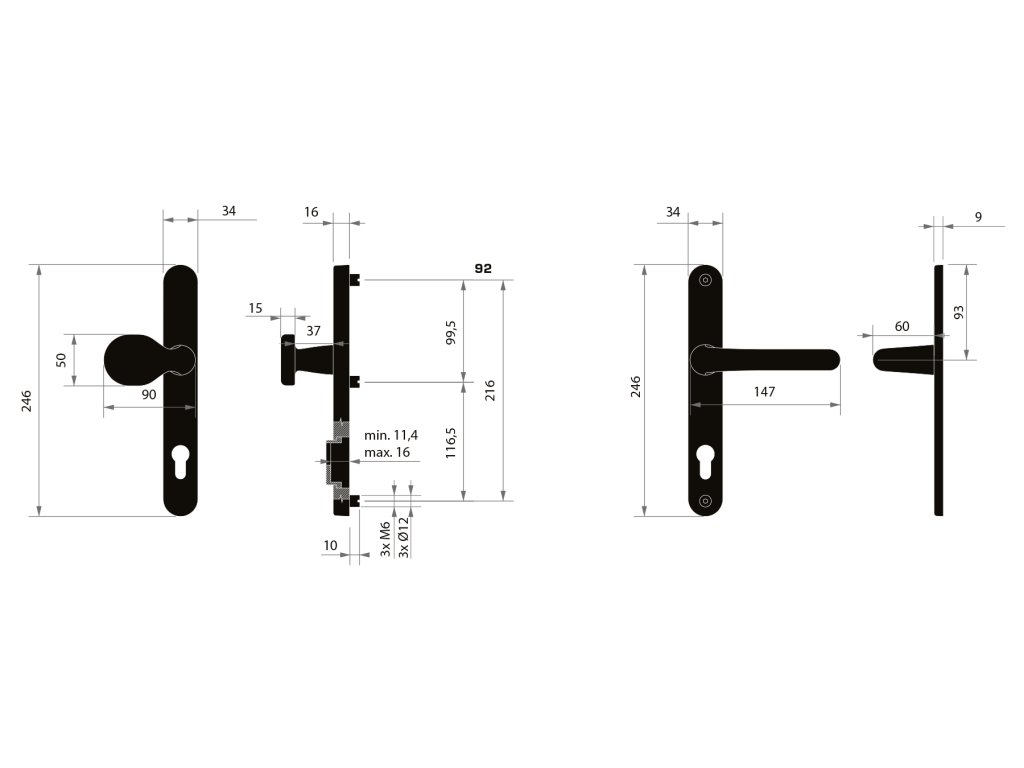 Kování se upevňuje třemi bezpečnostními šrouby, přičemž středový šroub je skrytý pod krytem. Model je dodávaný v rozteči 92 mm.