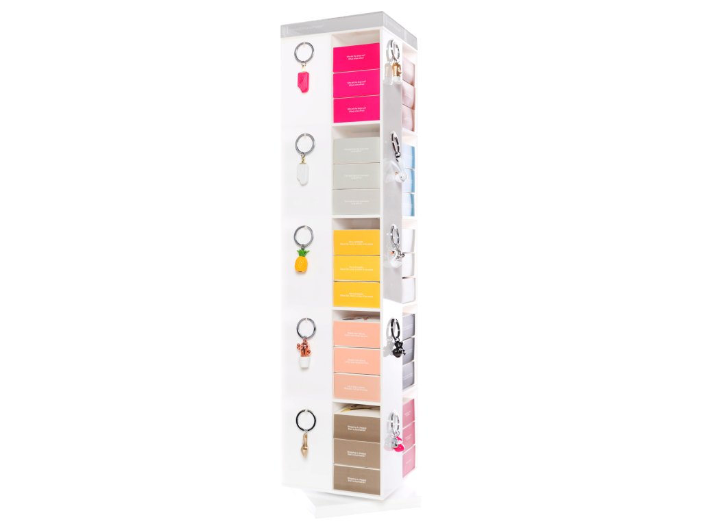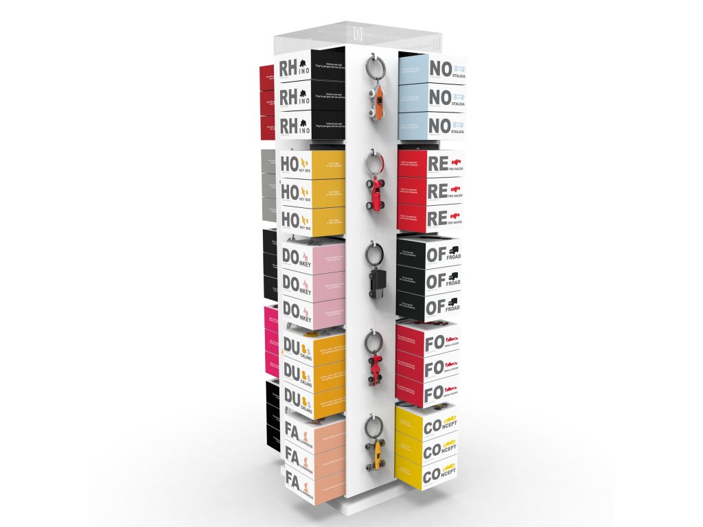 Střední otočný stojan na klíčenky MTM. Stojan obsahuje 20 poliček a 20 věšáčků na klíčenky.