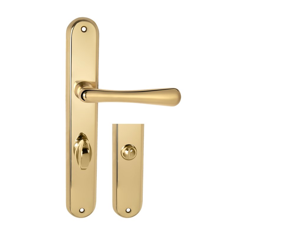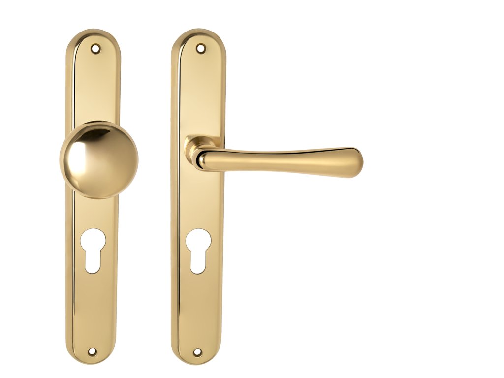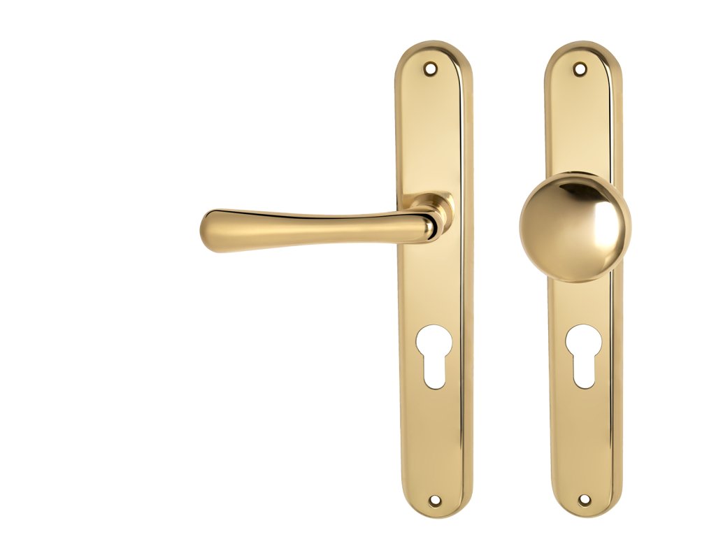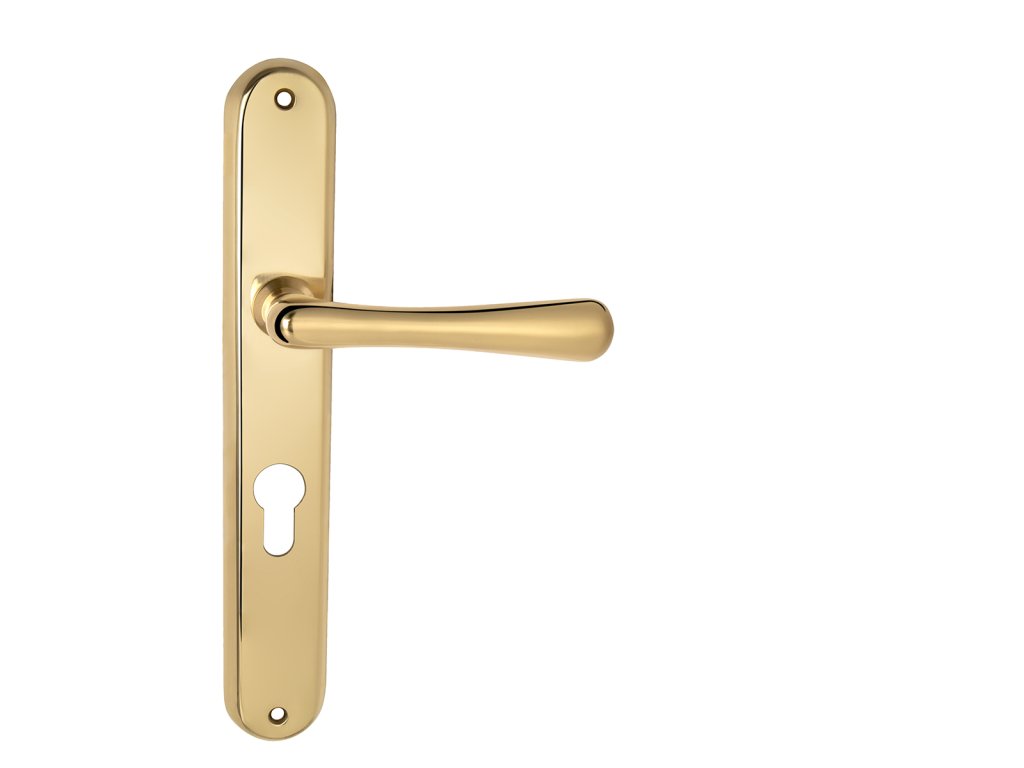 Štítová klika na interiérové dveře s oválným štítem je vyrobena z materiálů vysoké kvality - mosaz a je povrchově upravena. Oválný štít má rozměry 37 mm x 240 mm a klika obsahuje vratný mechanismus.