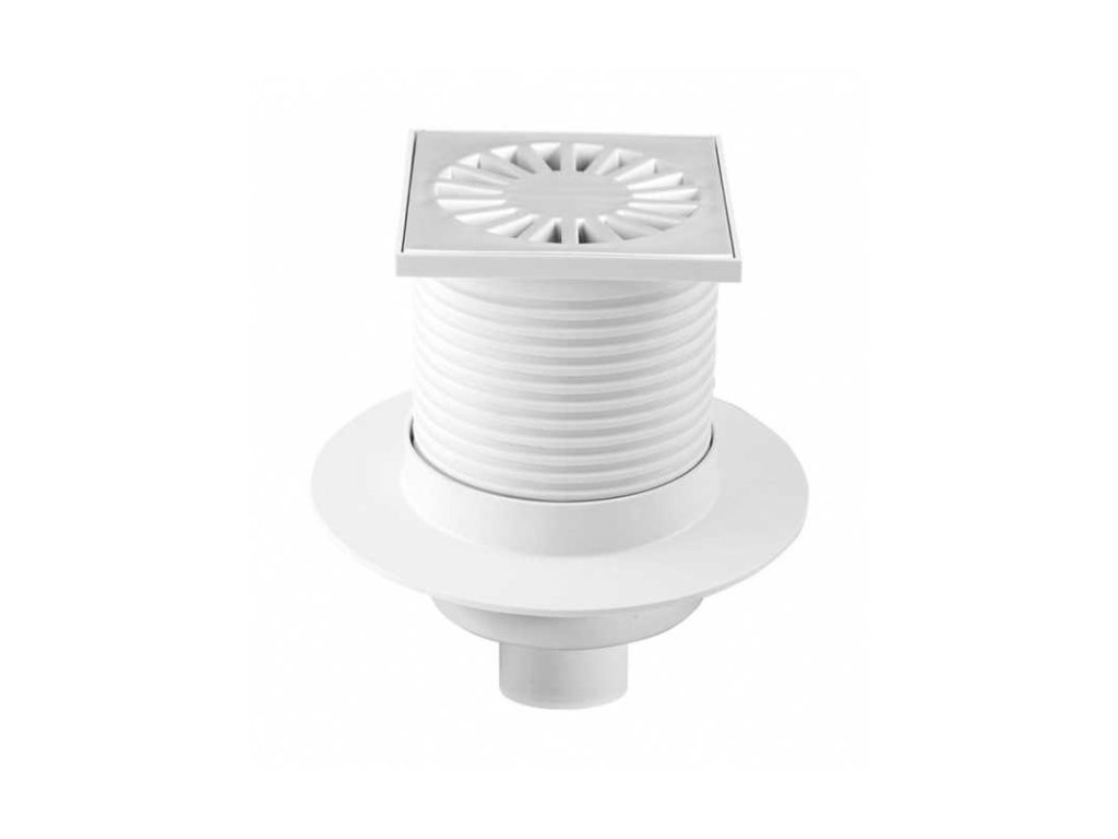 Pro svádění vod uvnitř budov. Přírubu vpusti lze použít pro napojení s hydroizolační fólií nebo stěrkou. Výškově nastavitelný nástavec s mřížkou, svislý odtok DN 50.