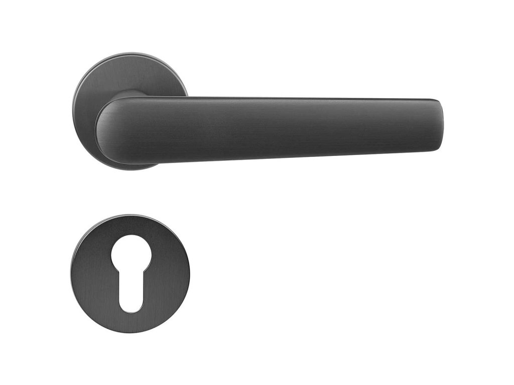 Hliníkové kování na kulatých rozetách s vratnou pružinou klik.