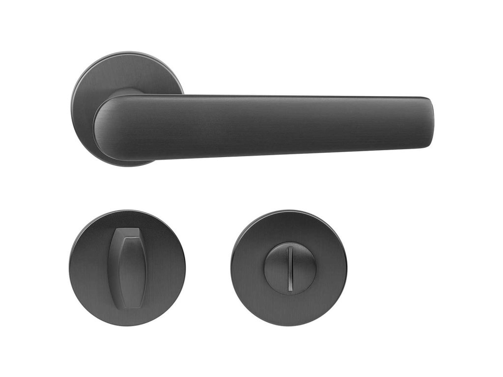 Hliníkové kování na kulatých rozetách s vratnou pružinou klik.