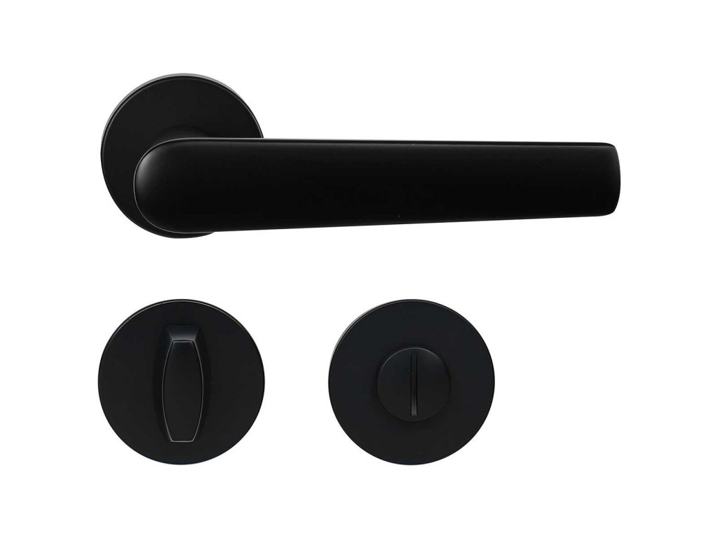 Hliníkové kování na kulatých rozetách s vratnou pružinou klik.