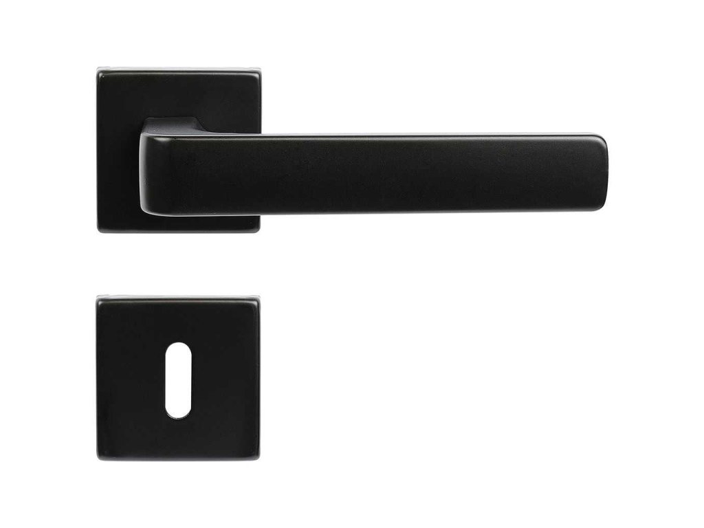Dveřní ocelové kování se čtvercovými rozetami v černém matném povrchu.